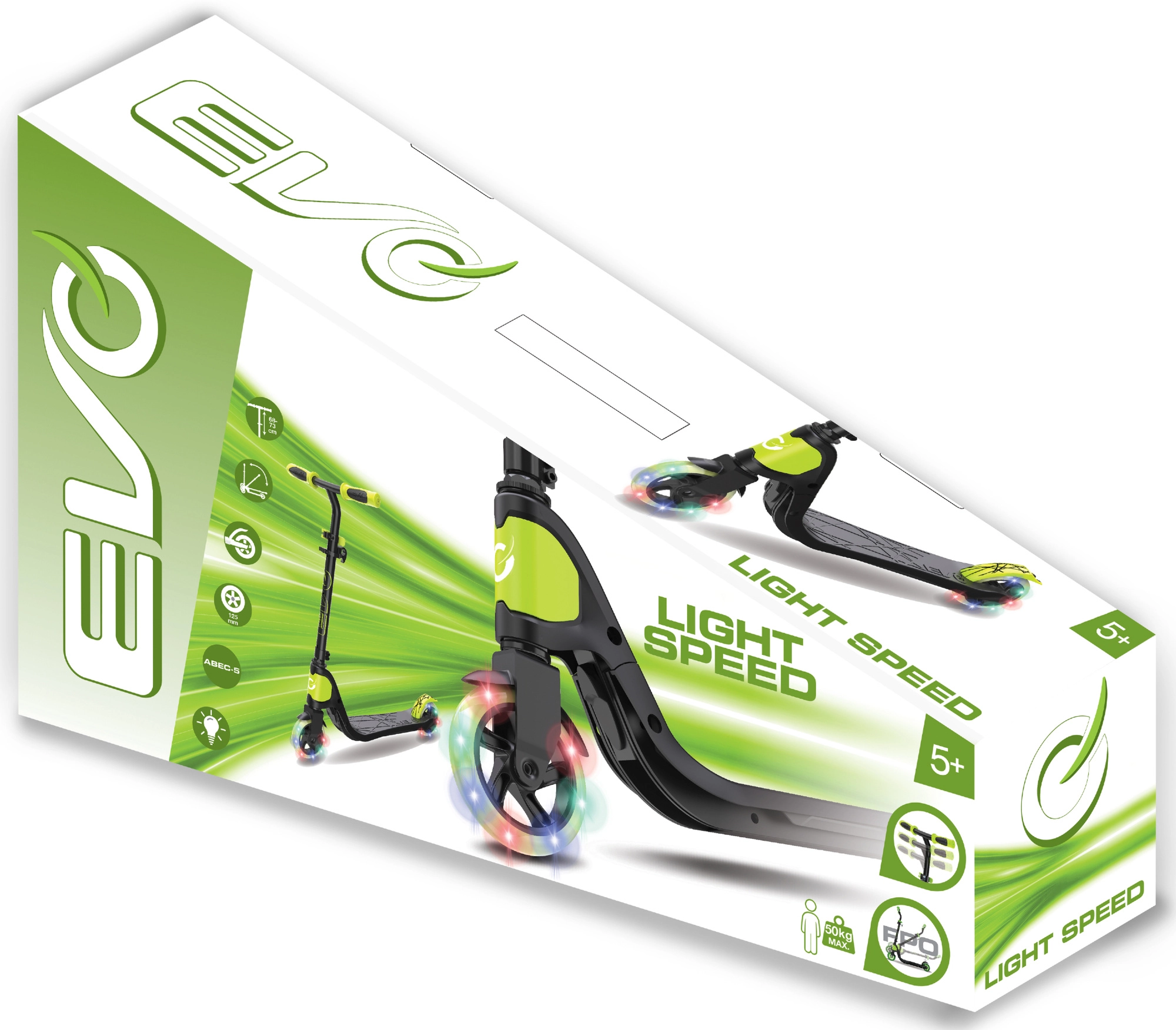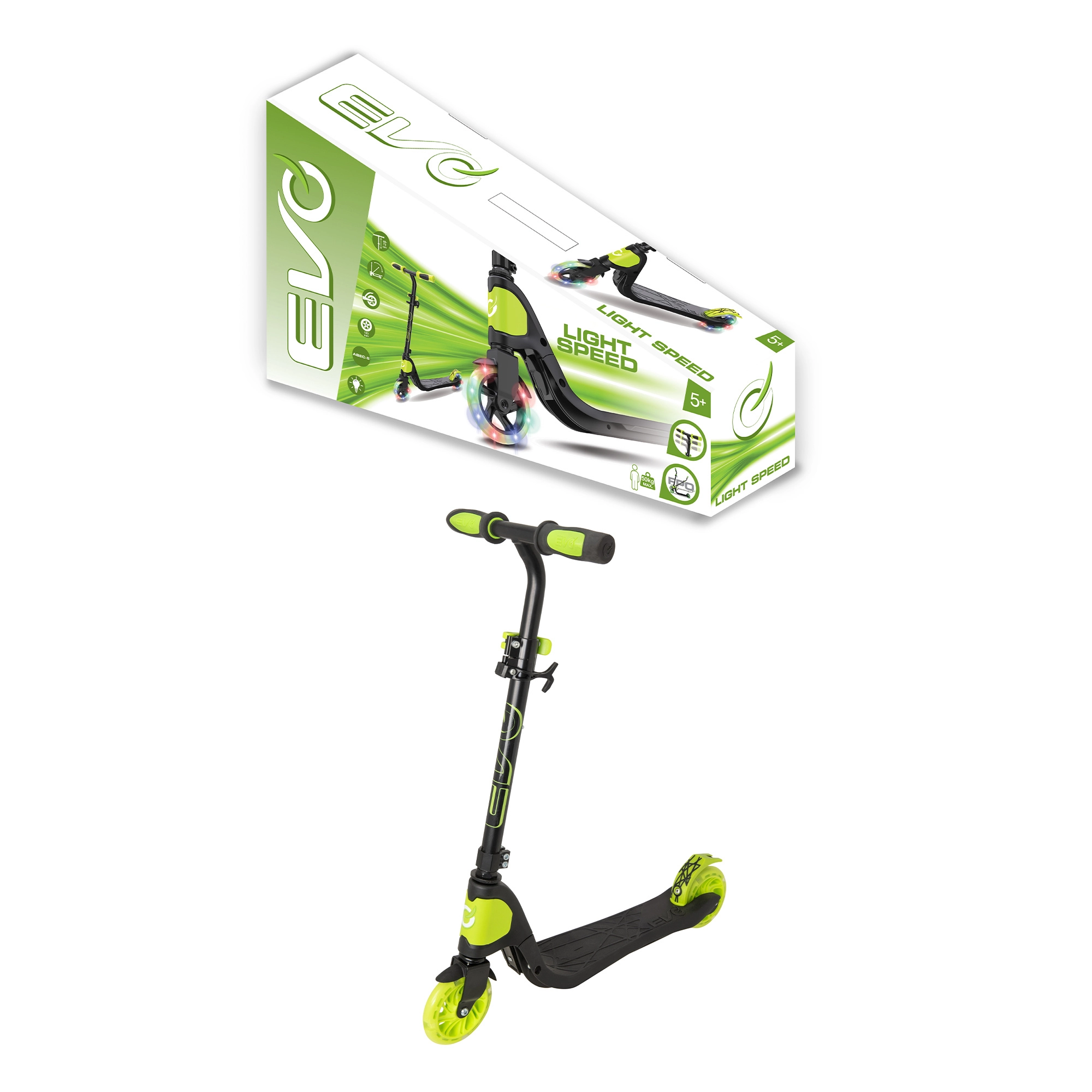 EVO Light Speed izvrstan je dječji romobil za svakodnevne vožnje po pločniku i na igralištu. Podesiva visina upravljača (oko 75–80 cm) raste zajedno s djetetom, svjetleći kotači uljepšavaju svaku vožnju, a stražnji blatobran ujedno služi kao učinkovita nožna kočnica. Niska masa i mogućnost sklapanja olakšavaju prenošenje i pohranu.