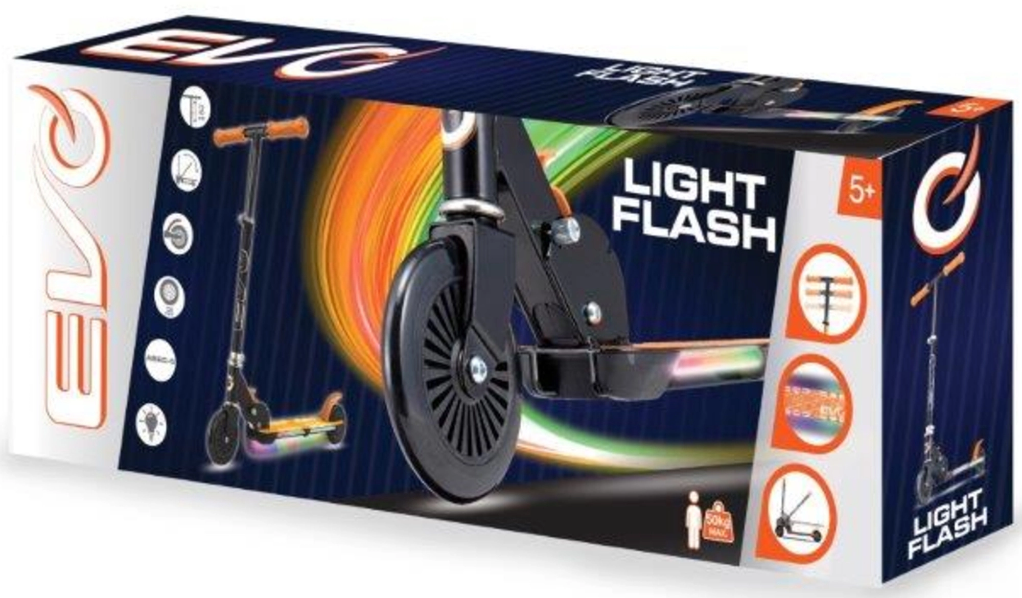 Lagan i izdržljiv dječji romobil EVO Light Flash nudi svjetleću LED podnicu, podesiva upravljača i sklopivu konstrukciju za lako prenošenje. Prikladan za djecu od 5 godina, s tihim kotačima s ležajevima ABEC-5 i nožnom kočnicom za sigurno zaustavljanje.