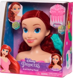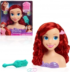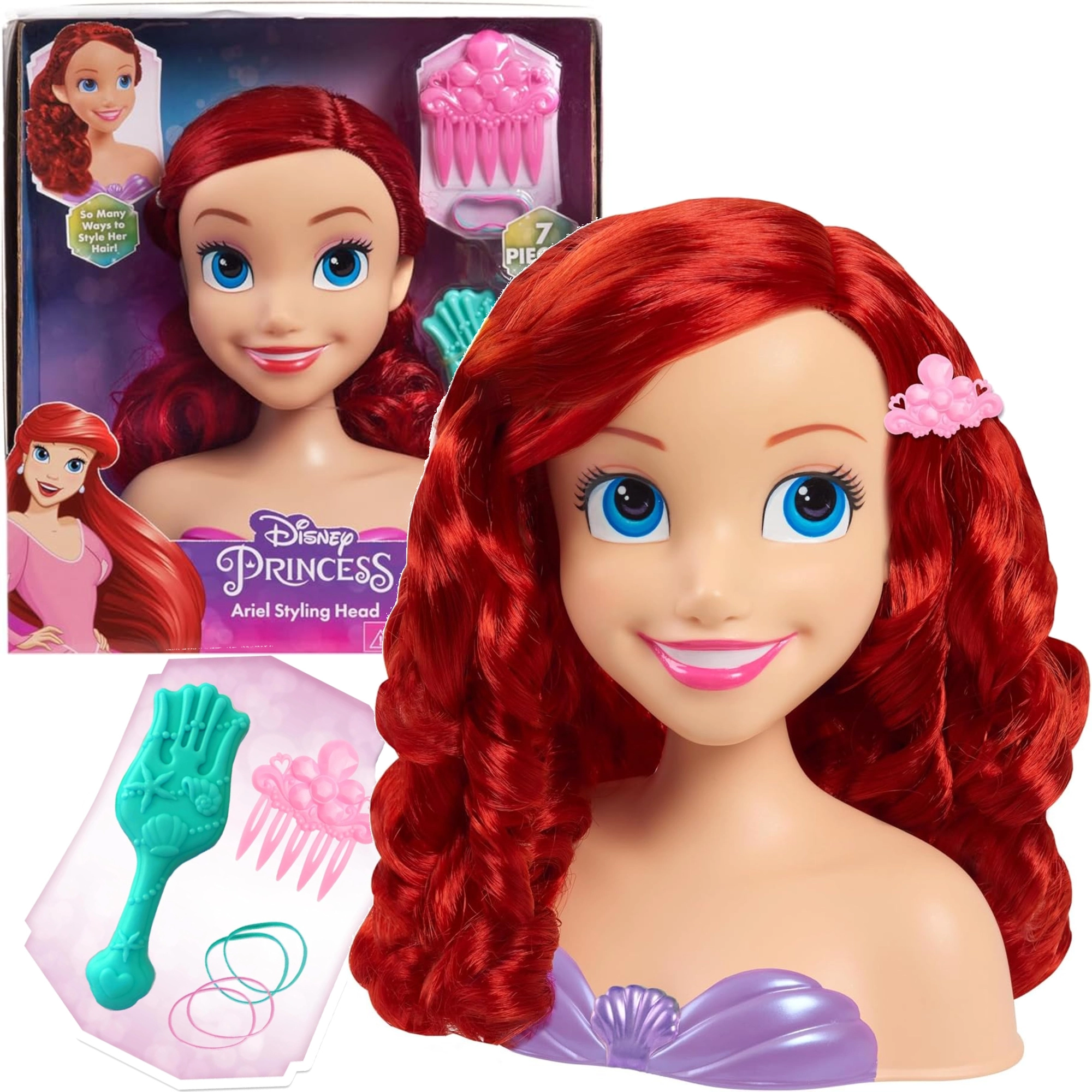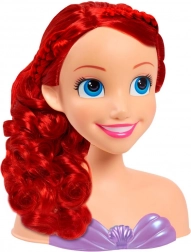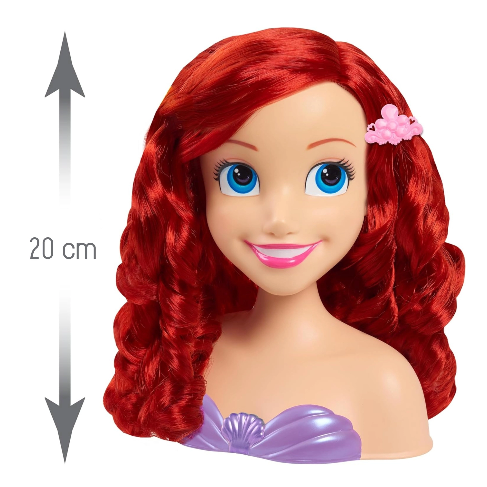 Glava za češljanje DISNEY princeza Ariel vjerno prikazuje omiljenu morsku vilu s plavim očima i dugom, kovrčavom crvenom kosom. Stabilan plastični poprsni stalak s ljubičastim školjkastim topom olakšava stiliziranje i drži glavu čvrsto na mjestu kako bi djeca mogla u potpunosti uživati u frizerskoj igri.