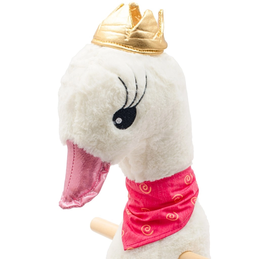 Ovaj elegantni bijeli labud s ružičastim detaljima i zlatnom krunom oduševit će male princeze i njihove roditelje. Igračka je izrađena od mekanog i ugodnog materijala, dok drvena baza s kotačima omogućuje lako izmjenjivanje između ljuljanja i vožnje. Integrirana melodija potiče osjetilni razvoj i daje igri novu dimenziju.