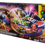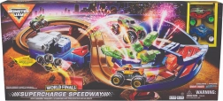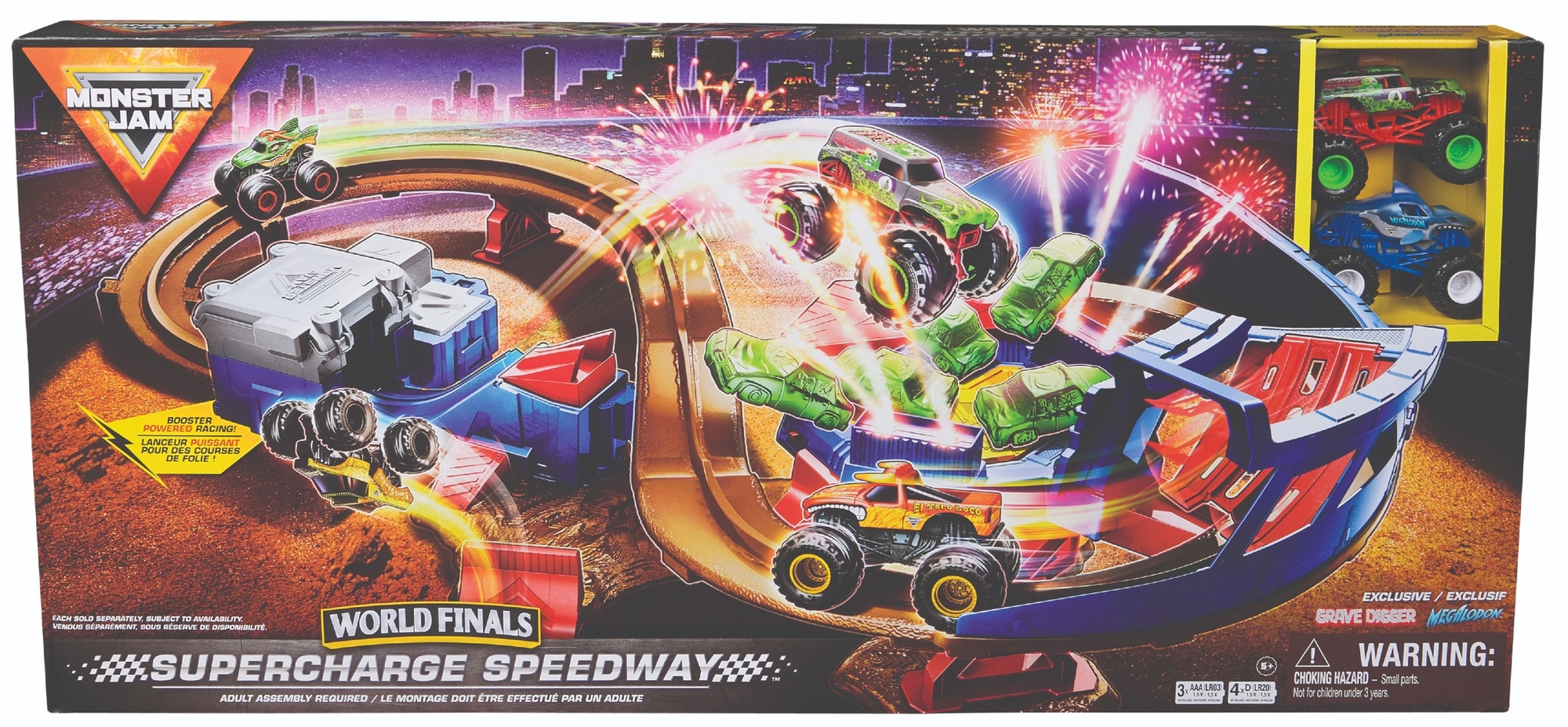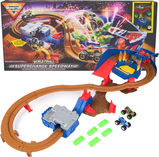 Set MONSTER JAM Supercharge Speedway pretvara stol ili pod u arenu punu adrenalina. Ručno upravljani lanser šalje truckove do velikih brzina, dok povišeni dijelovi, mostići i zavoji vode ravno u osvijetljenu crash zonu za efektne udarce i doskoke. Nakon odvoženog kruga vozila se vraćaju na start – zabava traje bez pauze.
