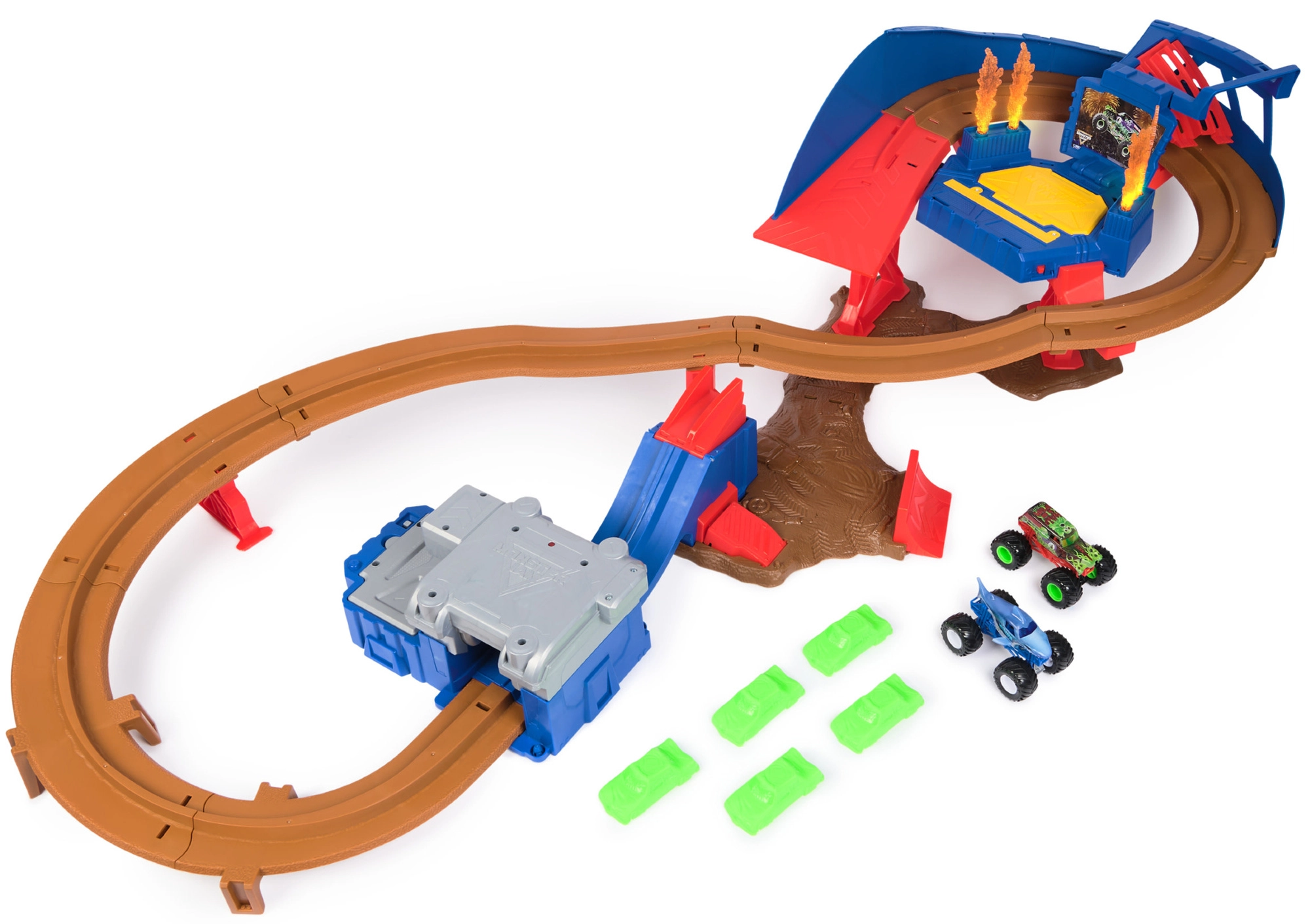 Pokrenite kućnu MONSTER JAM arenu do maksimuma! Ovaj kaskaderski trkaći set sa svjetlima donosi ručni lanser, brze zavoje, ciljanu crash zonu i neprekinutu stazu za kontinuiranu vožnju. U pakiranju su 2 metalna trucka u mjerilu 1:64 od SPIN MASTER-a – idealno za napete utrke, skokove i sudar-kaskaderske trikove.