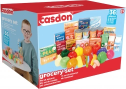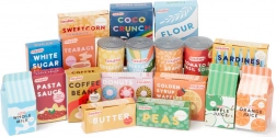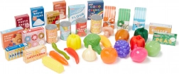 Uz ovaj bogato opremljen set djeca će uživati u satima maštovite igre. U njemu će pronaći plastično voće i povrće (npr. banana, grožđe, kukuruz, paprika, luk, češnjak ili šampinjon) te mini pakiranja uobičajenih namirnica (brašno, šećer, kava, mlijeko, grašak, grah, sardine) kao i napitke ili juhe. Realistični oblici, boje i otisci potiču učenje kroz igru.
