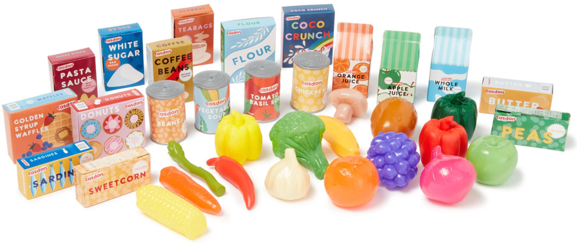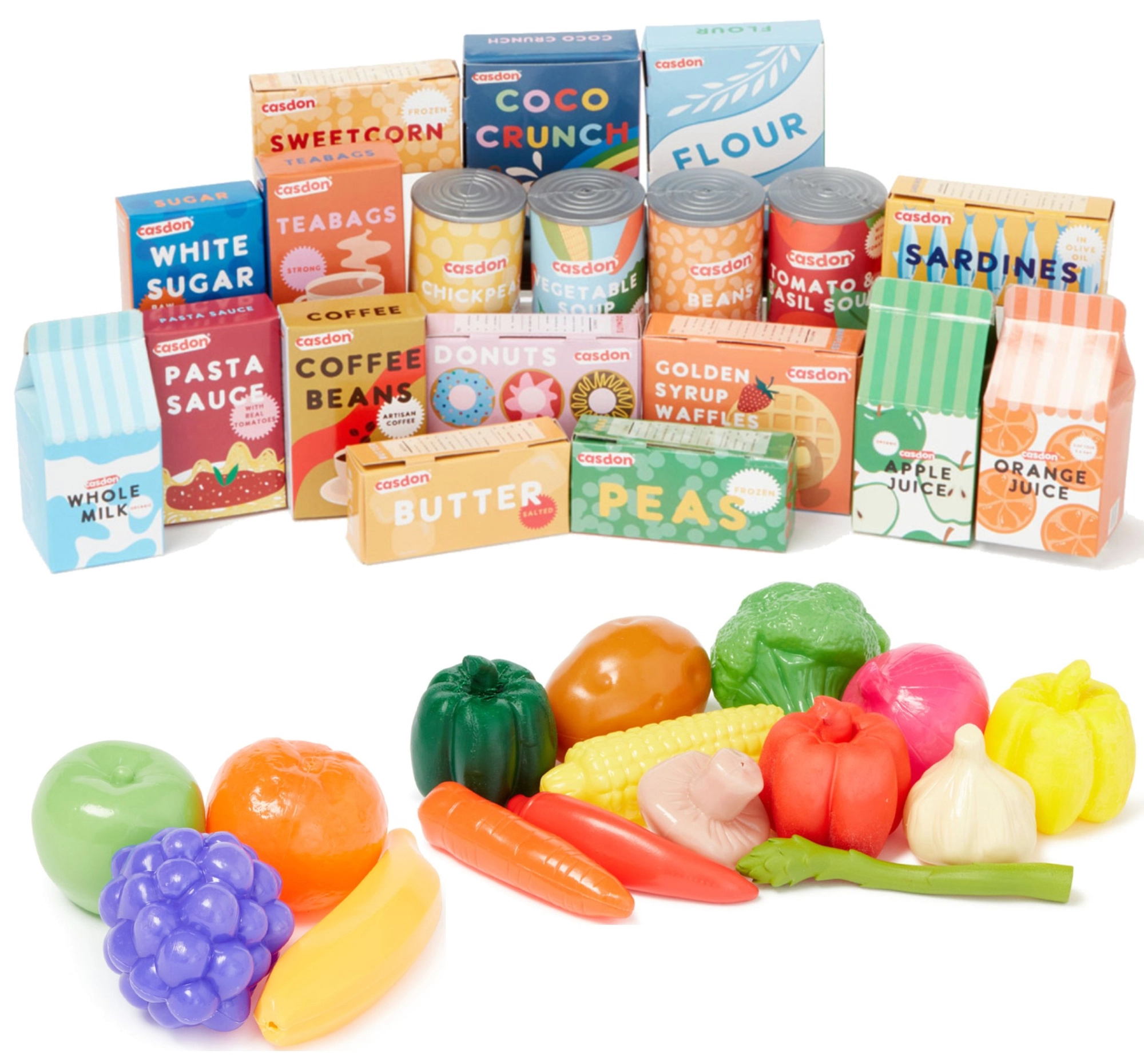 Set je lagan, izdržljiv i prilagođen malim dječjim rukama. Odličan je za igru kuhanja, kupovine i posluživanja u trgovini, ali i za aktivnosti razvrstavanja i upoznavanja namirnica. Zahvaljujući univerzalnoj kompatibilnosti nadopunjuje većinu dječjih kuhinja i dućana.