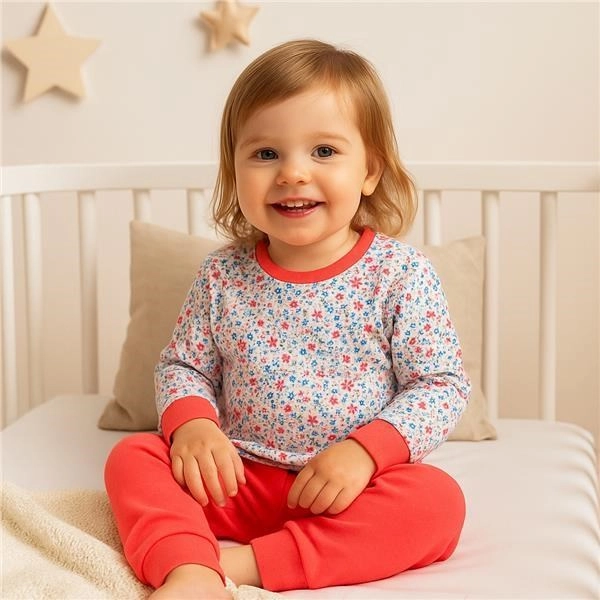 Dječja pamučna pidžama New Baby Flowers dizajnirana je za udobnost tijekom cijele noći. Mekana majica bez kopčanja lako se oblači preko glave, a nerastezljivi, neljubajući ovratnik osigurava ugodno nošenje. Hlače imaju elastičan pojas s gumicom koji ne steže i rebraste rubove na nogavicama za bolje zadržavanje topline.