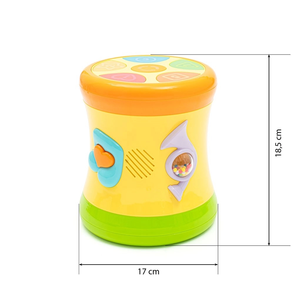 Interaktivni obostrani bubanj BABY MIX u žutoj boji oduševit će djecu od 10 mjeseci. Nudi 8 melodija, 12 veselih pjesmica, svjetlosne efekte i zvukove bubnja, koji potiču sluh, vid, finu motoriku i koordinaciju ruka–oko. Sjajna zabava i učenje u jednom.