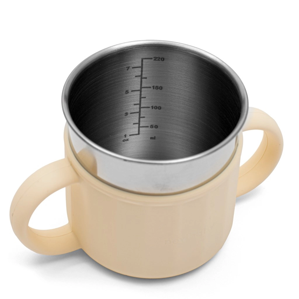Otkrijte stylish i funkcionalnu šalicu 2u1 NEW BABY koja raste s vašim djetetom. Kombinacija 50 % mekog silikona i 50 % nehrđajućeg čelika osigurava izdržljivost, higijenu i lako čišćenje. Zahvaljujući dvjema bočnim ručkicama šalica odlično leži i najmanjoj djeci, a decentan dizajn u bež boji uklapa se u svaki interijer.