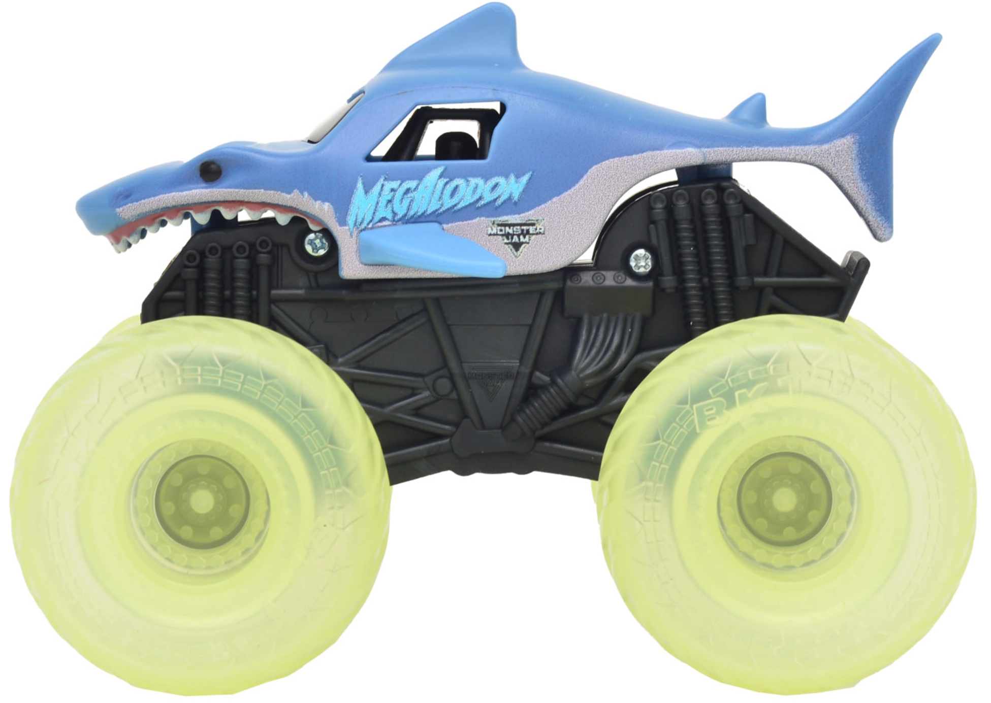 Popularni Megalodon, inspiriran pretpovijesnim morskim psom, impresionira realističnim detaljima karoserije u plavo‑sivim tonovima, perajama i zubima koji ističu agresivan izgled. Veliki, prozirno tonirani kotači i robusno šasija idealni su za akrobacije kod kuće i na putu.