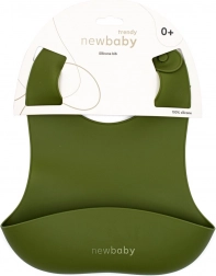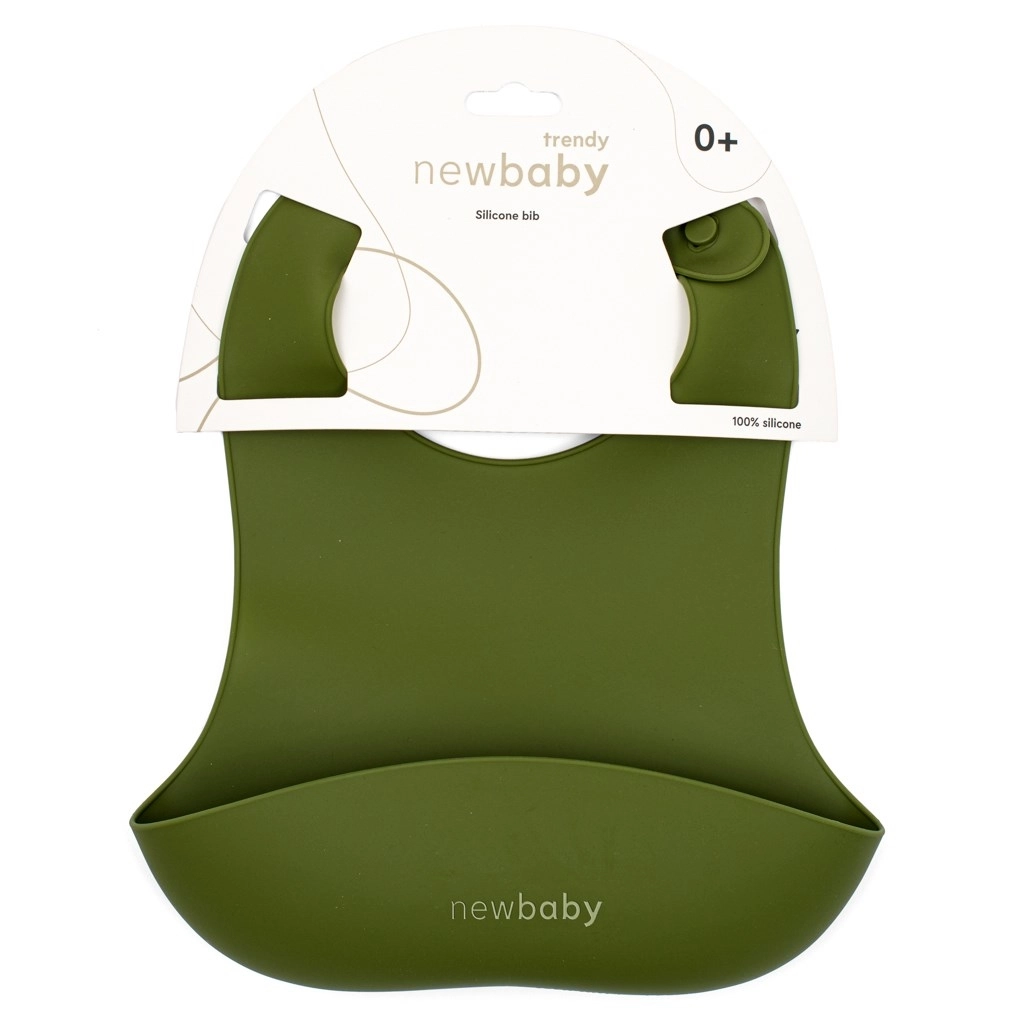 Praktična i stilizirana silikonska podbradnica NEW BABY u maslinasto zelenoj boji osigurava čistoću tijekom hranjenja zahvaljujući dubokom džepiću za hvatanje ostataka. Izrađena je od 100% silikona bez BPA, ima podesivo kopčanje i lako se pere i održava.