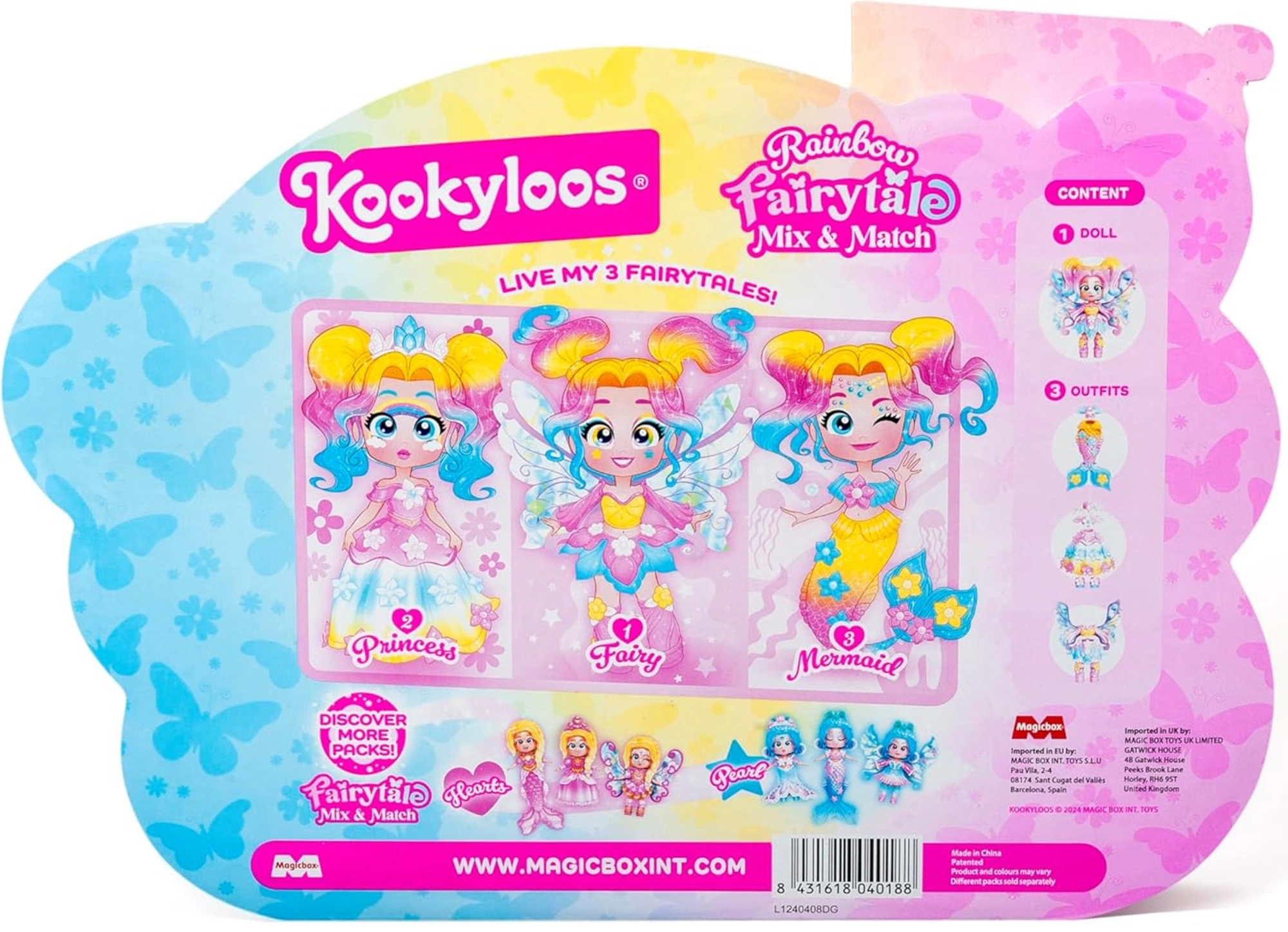 Otkrij čarobni svijet KookyLoos s figuricom Fairytale Rainbow 3u1! Jedna lutka s mjenjivim izrazima lica, mix & match odjećom i trima ulogama – princeza, vila i sirena. Zahvaljujući pokretnim zglobovima, blistavim dodacima i kompatibilnim dijelovima, savršen je izbor za kreativnu igru i kolekcionarsko veselje.