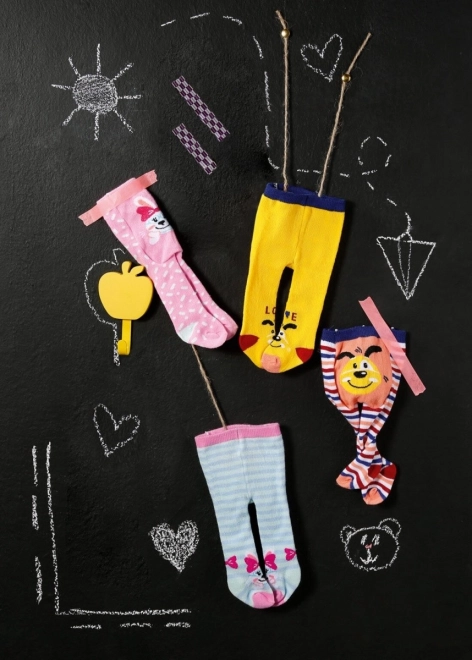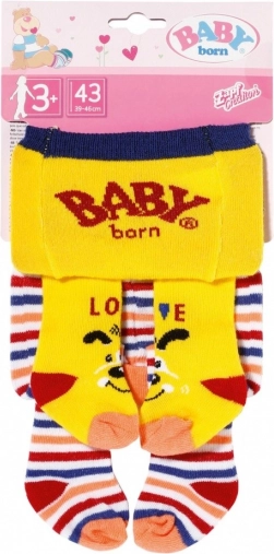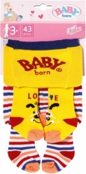 Baby Born tajice donose udobnost i stil u jednom pakiranju, obogaćenom razigranim uzorcima. Zahvaljujući motivima zekića Benna i psića Bella djeca će biti oduševljena. Prvi par u kombinaciji ružičaste i plave iznenađuje Bennom koji maše s ružičastih tajica s plavom konfeti dekoracijom te zekićem na plavim prugama. Drugi par nudi sunčano žute i šareno prugaste tajice sa slikom psića.
