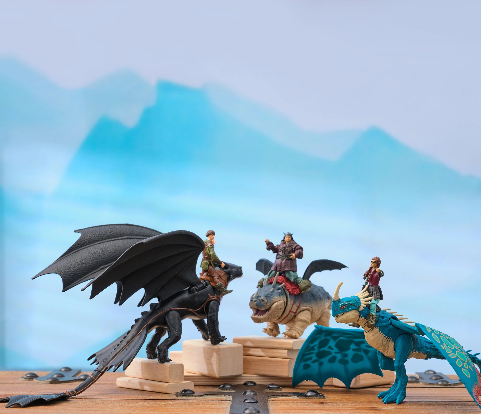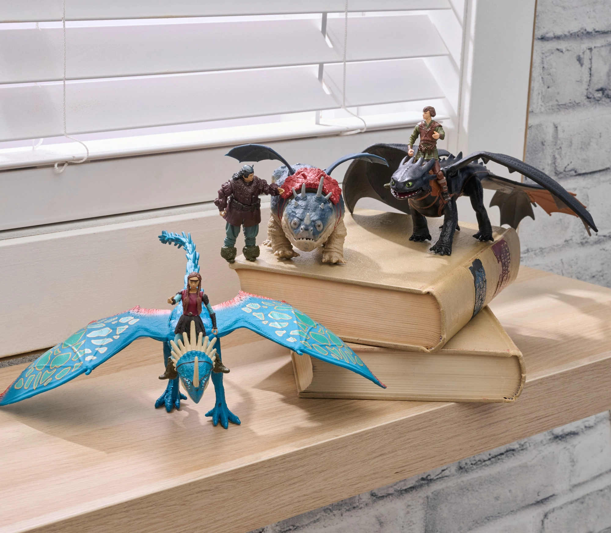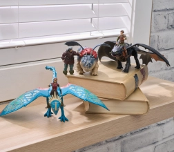 - Dragon & Viking Rider duo: Astrid (oko 7,5–7,6 cm) pričvršćuje se na zmaja (oko 25 cm) pomoću čvrstih držača u sedlu.