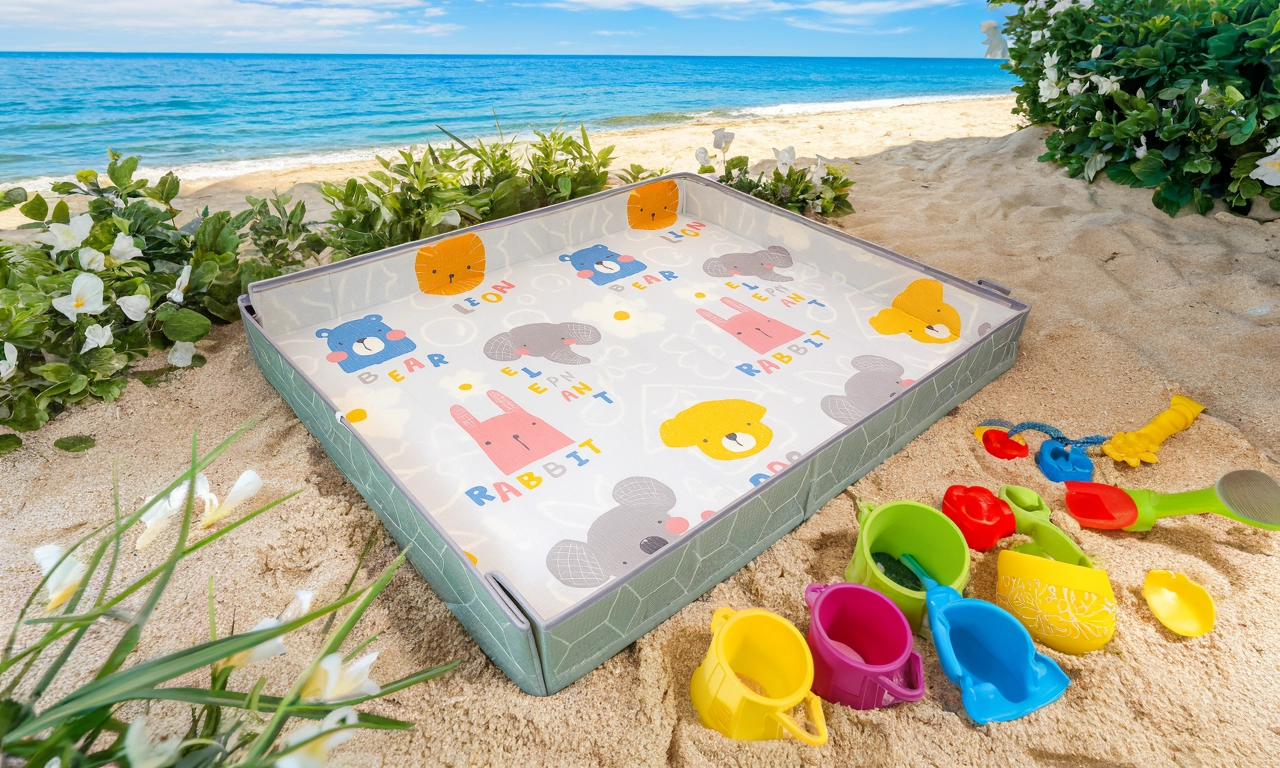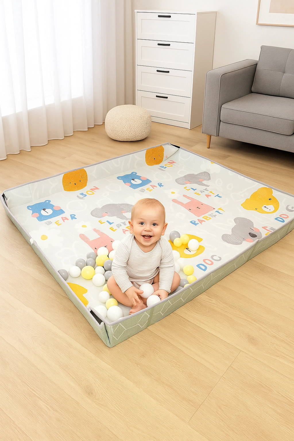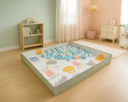 Posebne čičak trake omogućuju da u trenu podignete rubove i stvorite mekan ograđeni prostor ili ball pit – dovoljno je dodati loptice. Podloga je sklopiva, lagana i lako se čisti (dovoljna je vlažna krpa). U pakiranju se nalazi i praktična transportna torba s patentnim zatvaračem za jednostavno spremanje i prenošenje.