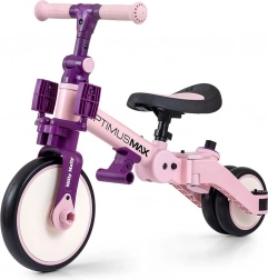 Model OPTIMUS MAX 5u1 kombinira nekoliko načina upotrebe: od prve vožnje uz podršku roditelja do samostalne vožnje na guralici ili triciklu s pedalama. Zahvaljujući čeličnom okviru, pjenastim gumama i promišljenim sigurnosnim elementima – uključujući 3-točkaste sigurnosne pojaseve, ograničivač zakretanja upravljača i preklopne stražnje kotačiće – pruža sigurnost i udobnost u svakoj fazi učenja.