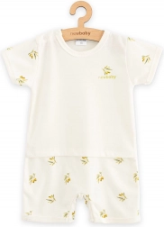 Stilizan ljetni bodi New Baby s kratkim rukavima u potpunosti je prekriven lijepim uzorkom maslina koji će uljepšati svaku kombinaciju. Preklopni kroj sa strane s vezicama i unutarnjim drukerom savršeno stoji na mjestu, dok drukeri između nogu znatno olakšavaju presvlačenje. Nježne gumice na nogavicama su blage i ne stišću.