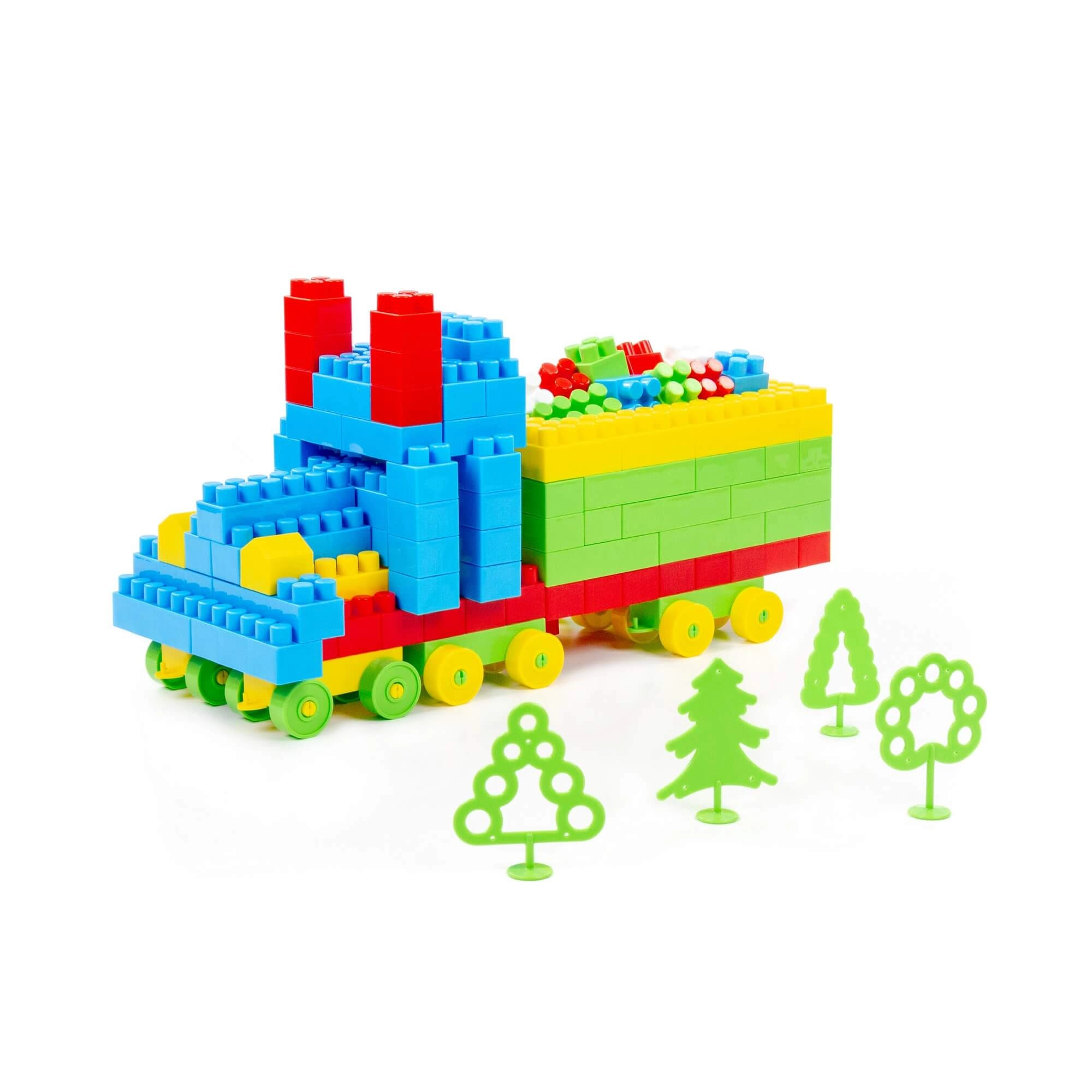 Zahvaljujući posebnim dijelovima s kotačima djeca lako izrađuju pokretni kamion s prikolicom i ukrašavaju scenu zelenim drvcima. Idealno za kreativnu igru prijevoza.