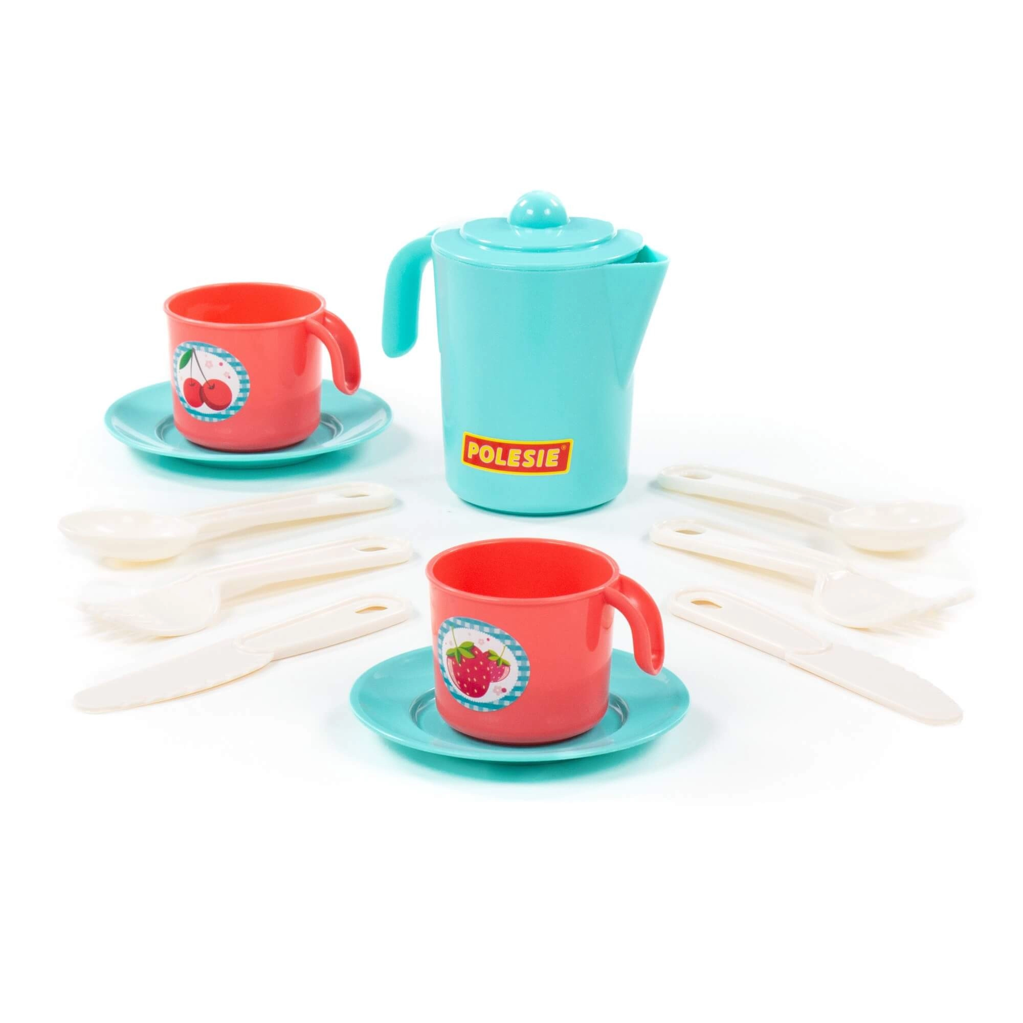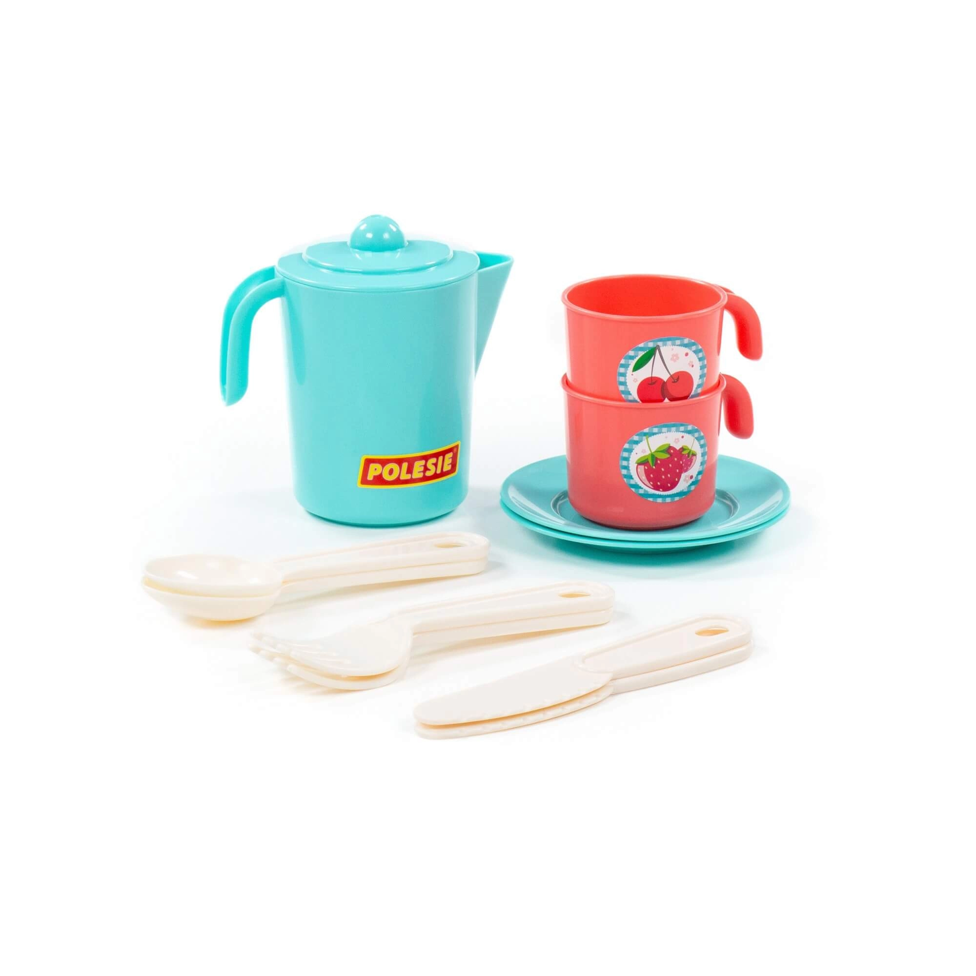 Komplet uključuje čajnik s poklopcem, 2 šalice s ručkicama, tanjuriće/podšalice i plastični pribor. Zahvaljujući sigurnim, glatkim rubovima i maloj težini, posuđem je lako rukovati. Kompaktne dimenzije cca 130 × 105 × 121 mm olakšavaju spremanje i prenošenje.