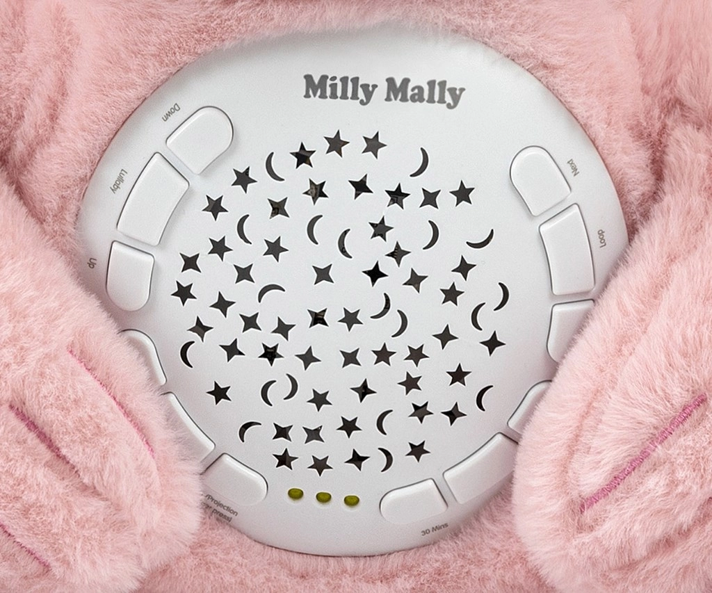 Plišani medvjedić MILLY MALLY donosi djeci miran san i osjećaj sigurnosti. Integrirani projektor stvara na stropu i zidovima nježne zvijezde, dok umirujuće melodije i bijeli šum pomažu opustiti se i lakše zaspati. Mekano, baršunasto izvođenje mami na maženje i prikladno je već od rođenja.