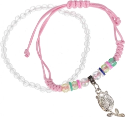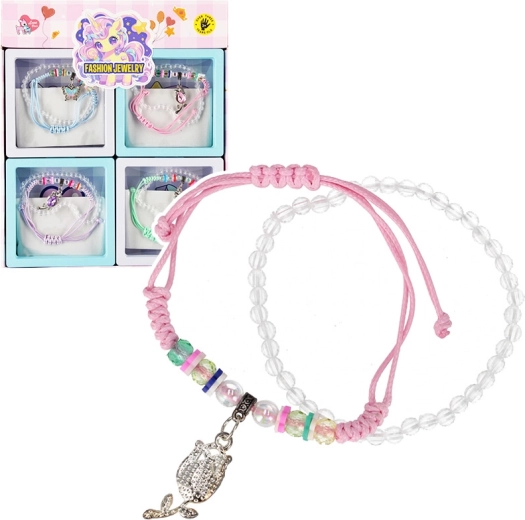 Narukvica je dostupna u različitim varijantama – od pastelnih končića do slatkih motiva privjesaka poput sove, leptira ili sitnih kamenčića. Lagana i udobna, idealna je za djecu koja vole modne dodatke.