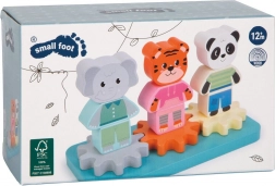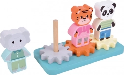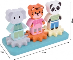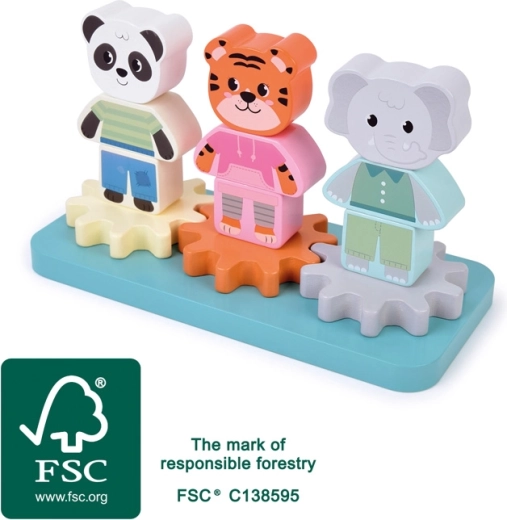 Tri simpatične figurice – slon, tigar i panda – sastoje se od obojenih, slagivih dijelova koje djeca mogu razvrstavati, kombinirati i slagati jednu na drugu. Pametni sustav zupčanika povezuje sve figurice: okretanjem jedne pokreću se sve, pa djeca odmah uočavaju uzrok i posljedicu.