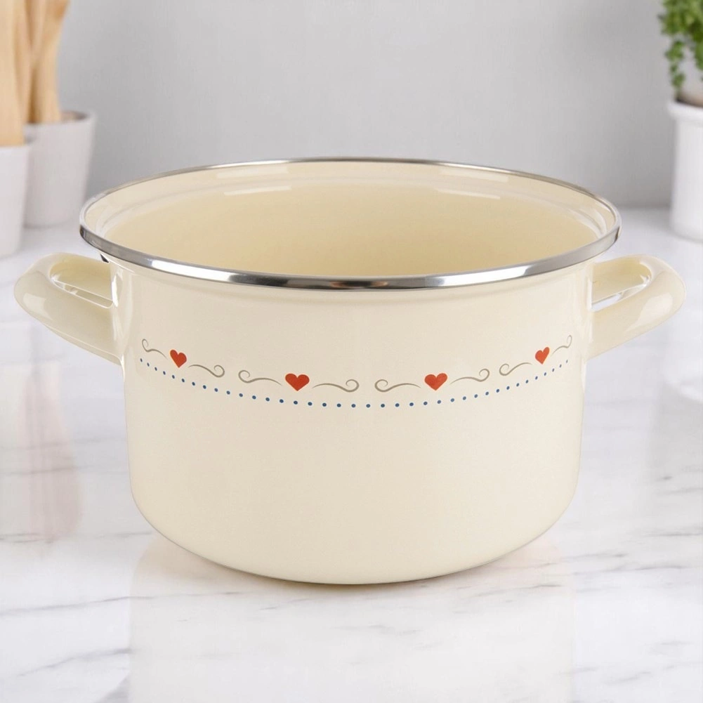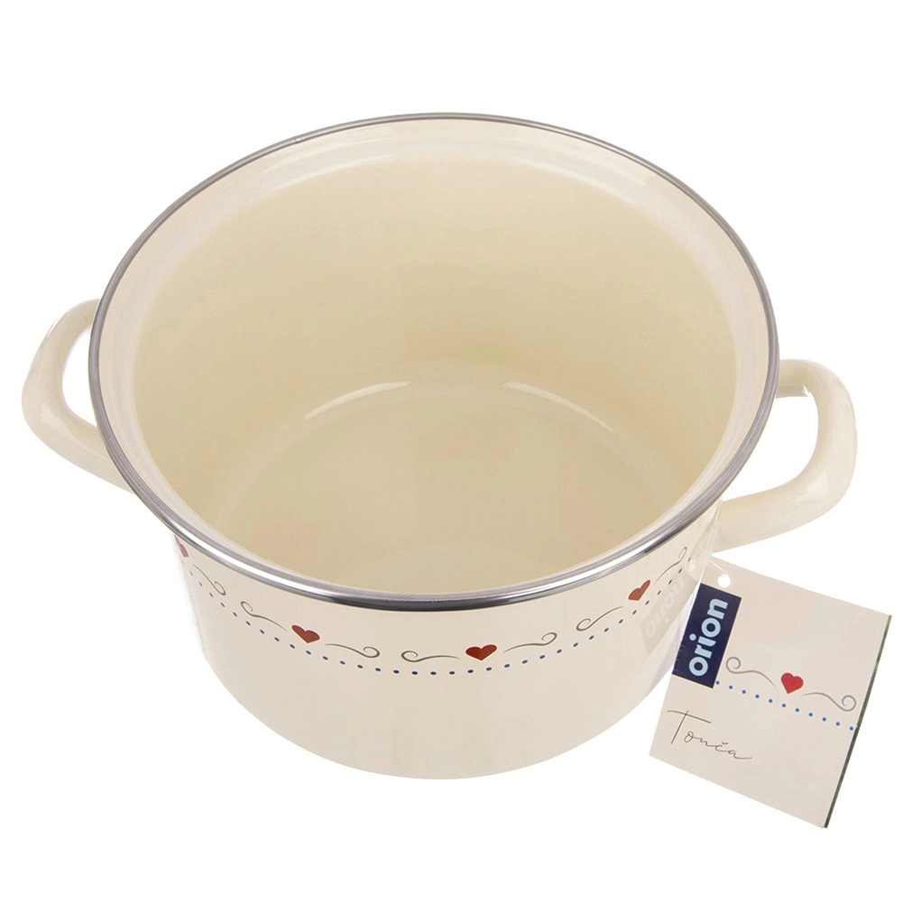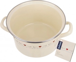Krem emajlirani lonac TONCA spaja retro izgled s modernom funkcionalnošću. Zdravstveno ispravna emajlirana ocel glatka je, lako se čisti i pogodna je i za alergičare. Elegantni dekor srca i nehrđajući obrub daju posudi izdržljivost i šarm za svakodnevno kuhanje i posluživanje izravno na stolu.