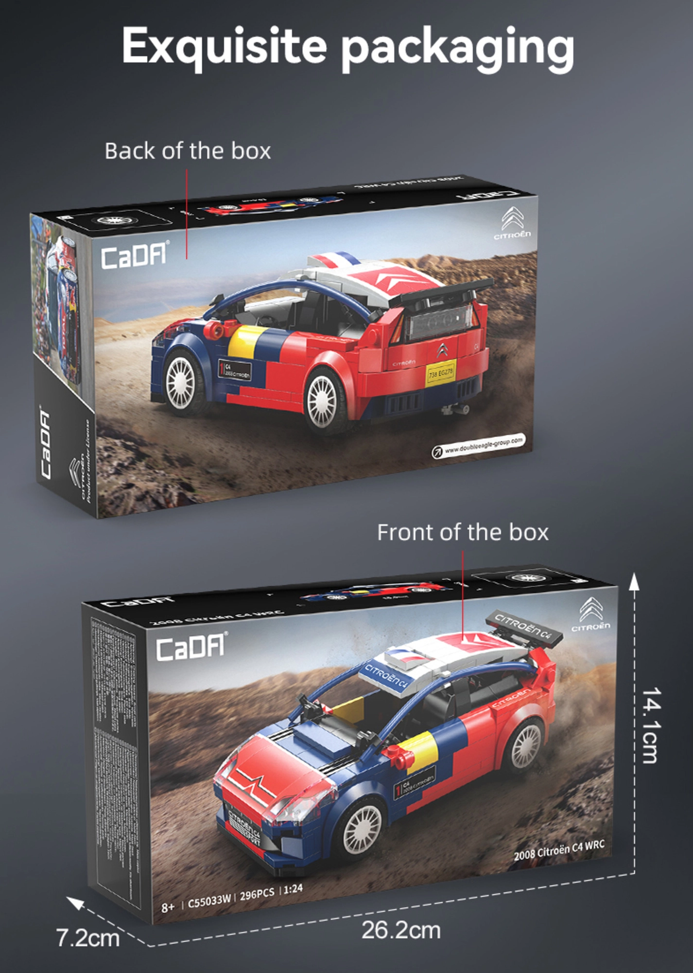 Uživajte u preciznoj gradnji i dojmljivom izgledu licenciranog modela CITROËN C4 WRC. Konstruktorski set CaDA nudi uravnoteženu kombinaciju jednostavne gradnje i izvrsne izrade, zahvaljujući kojoj nastaje statični model s glatkim kretanjem, spreman za vitrine i razigrane vožnje po ravnoj podlozi.