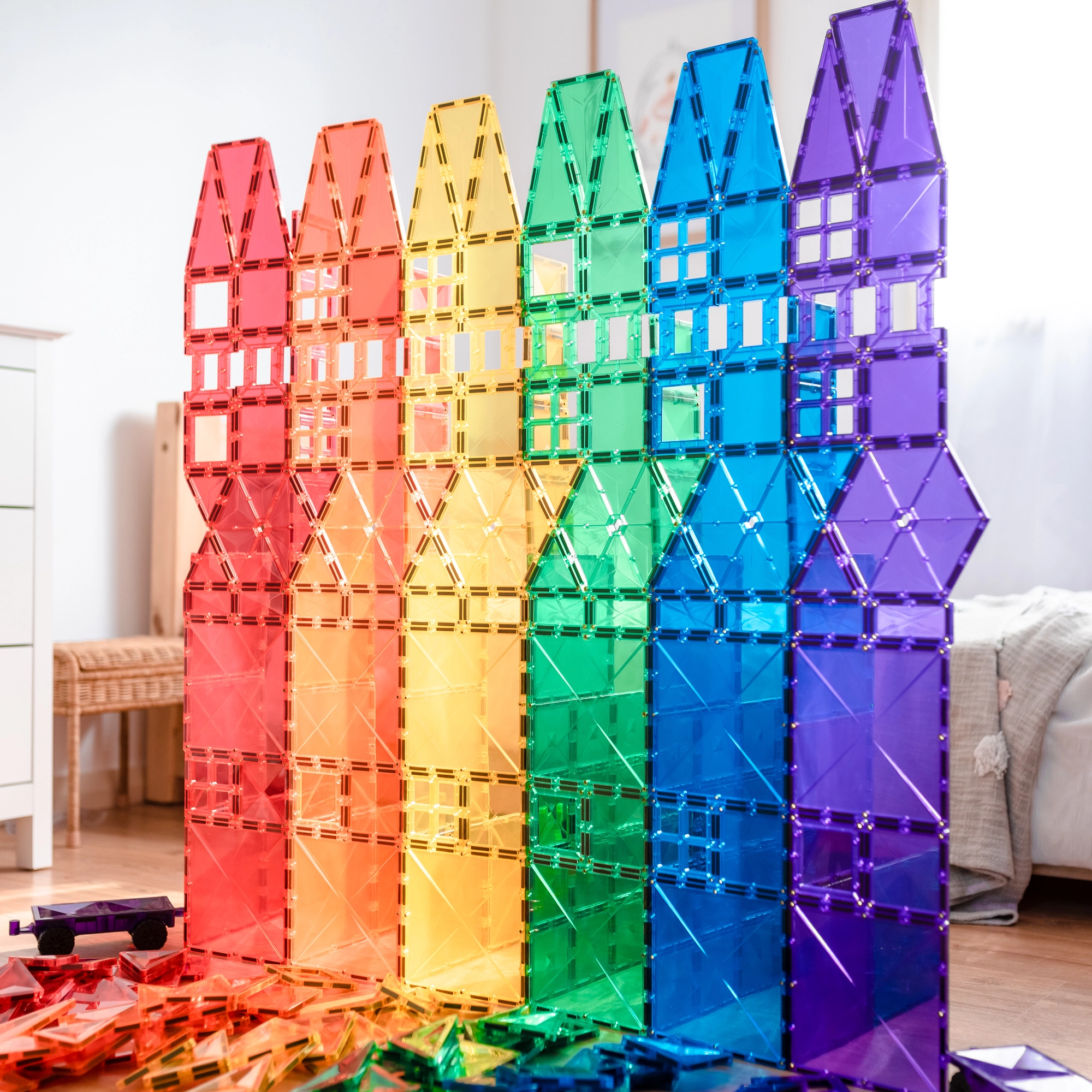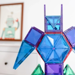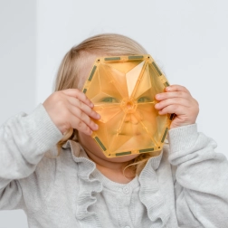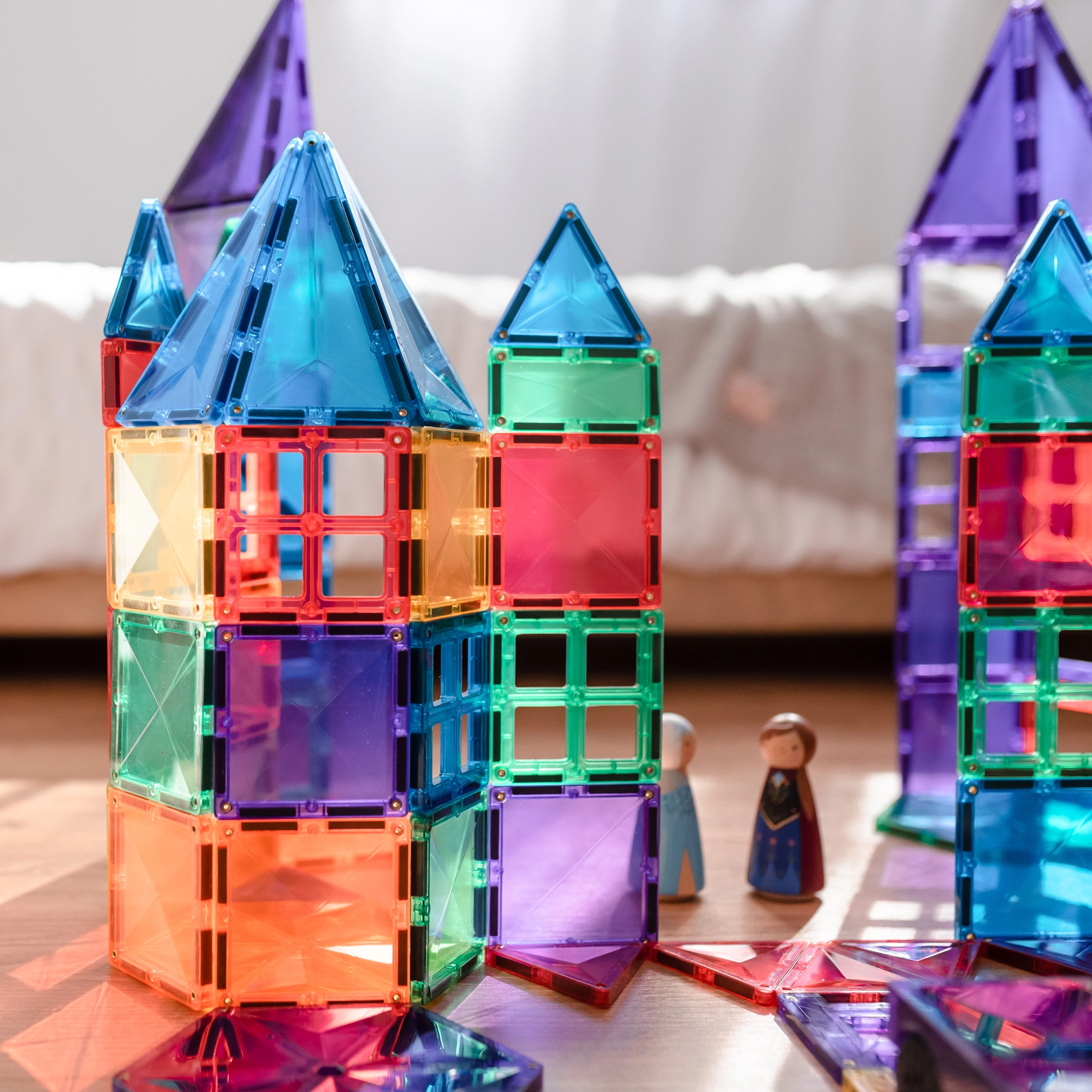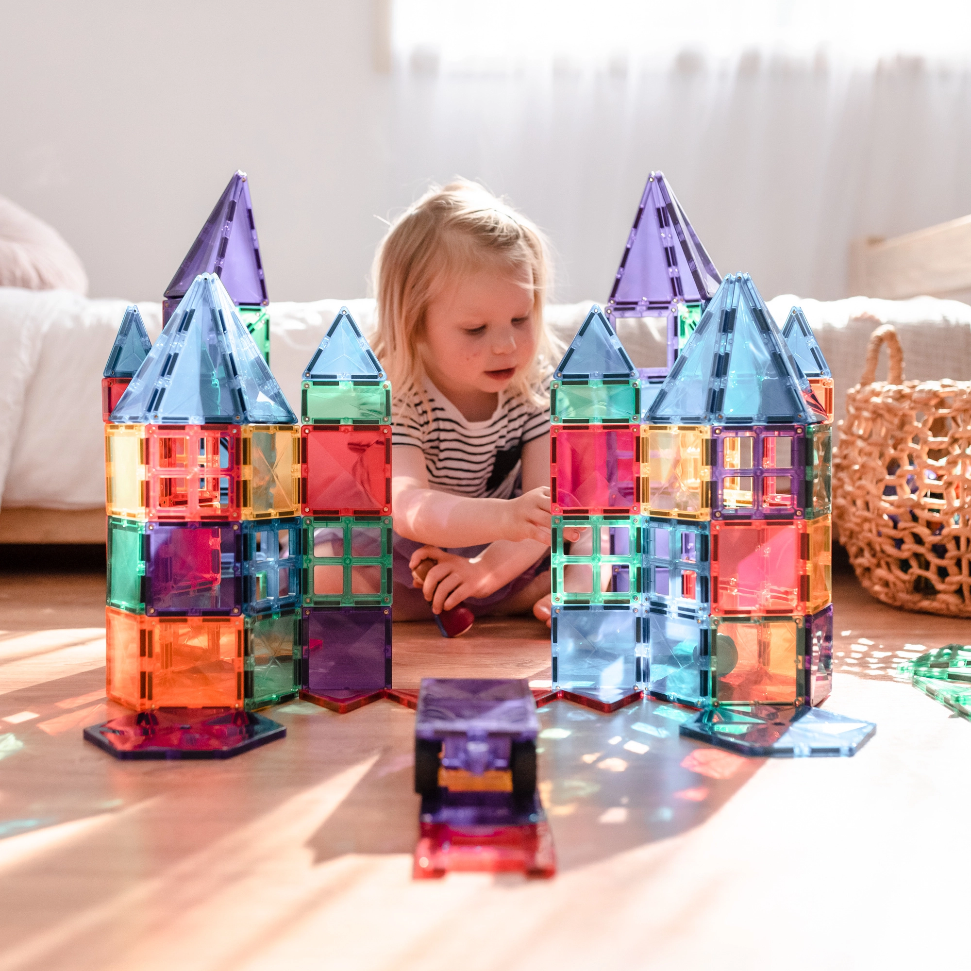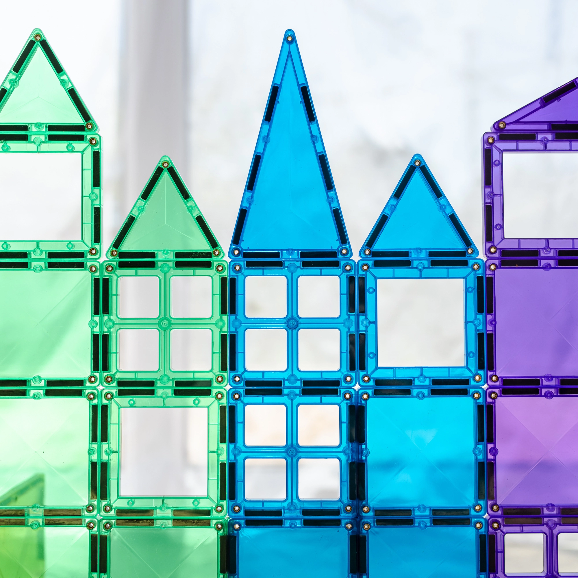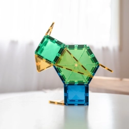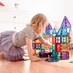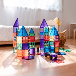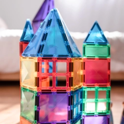 Prozirne magnetske pločice u zasićenim bojama omogućuju djeci graditi visoke tornjeve, dvorce i kuće te otkrivati svijet svjetla i sjena pri igri uz prozor ili s lampom.