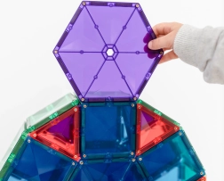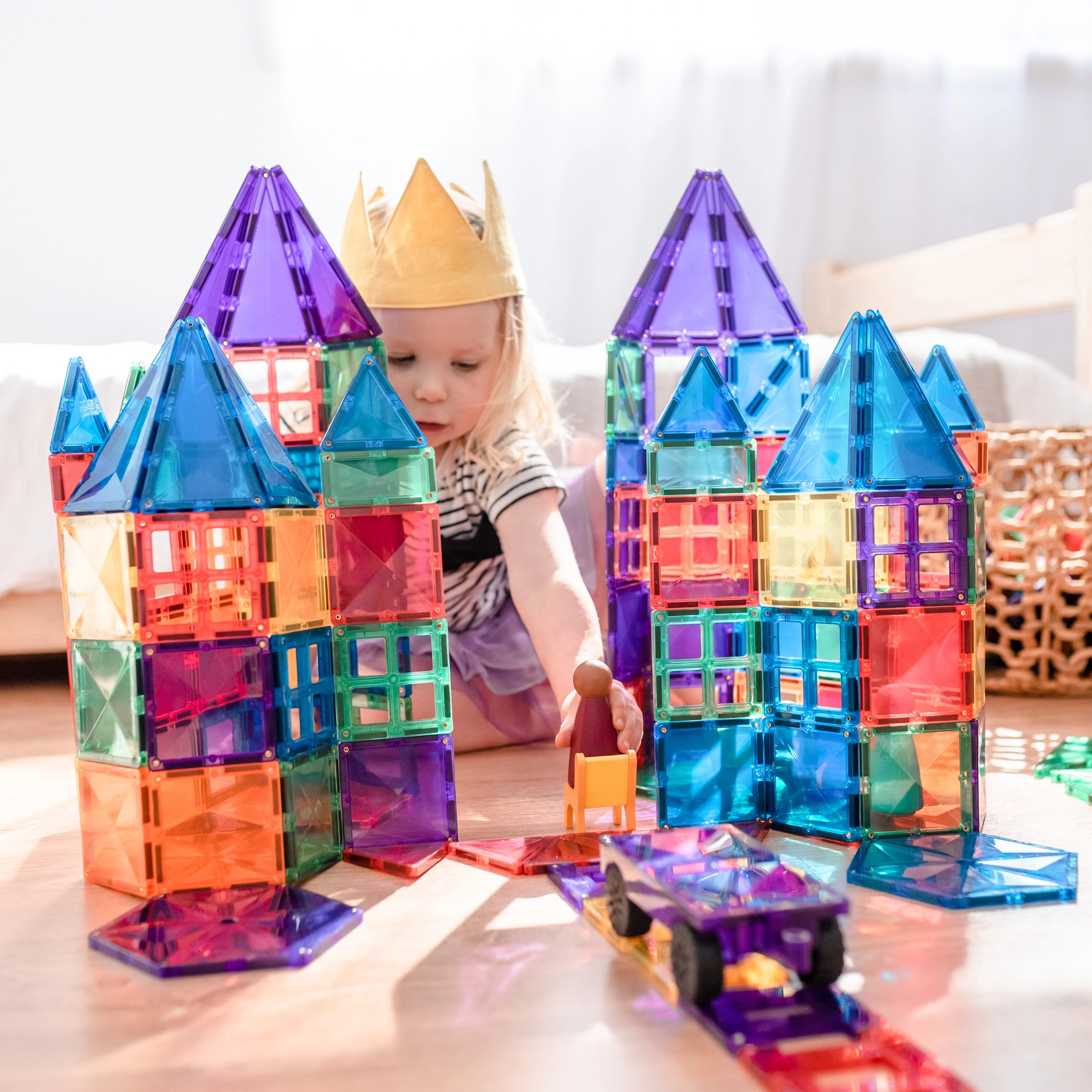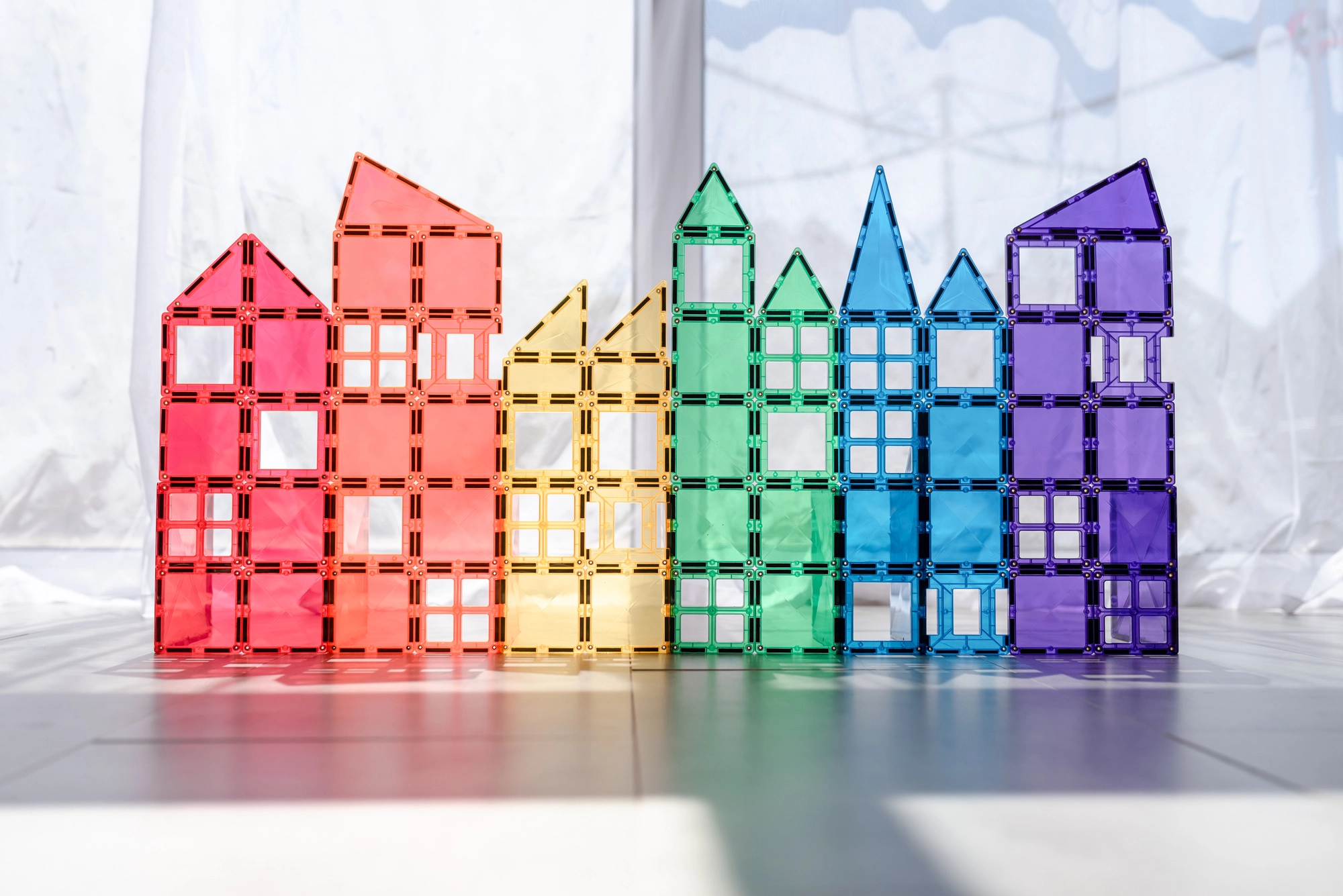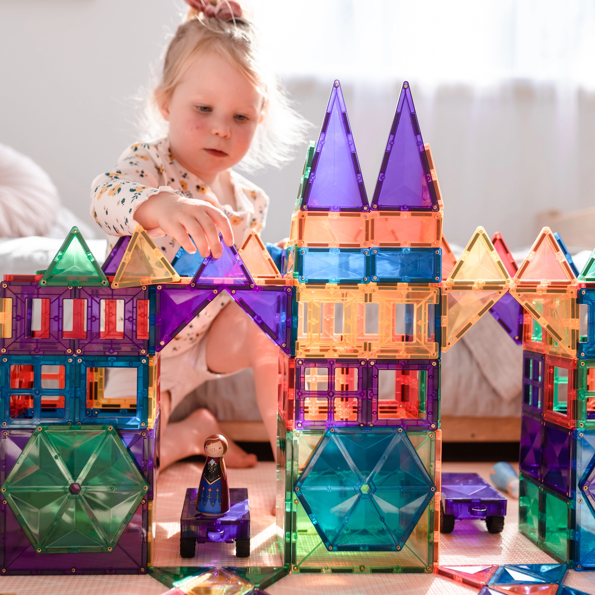 Prozirne magnetske pločice u zasićenim bojama omogućuju djeci graditi visoke tornjeve, dvorce i kuće te otkrivati svijet svjetla i sjena pri igri uz prozor ili s lampom.