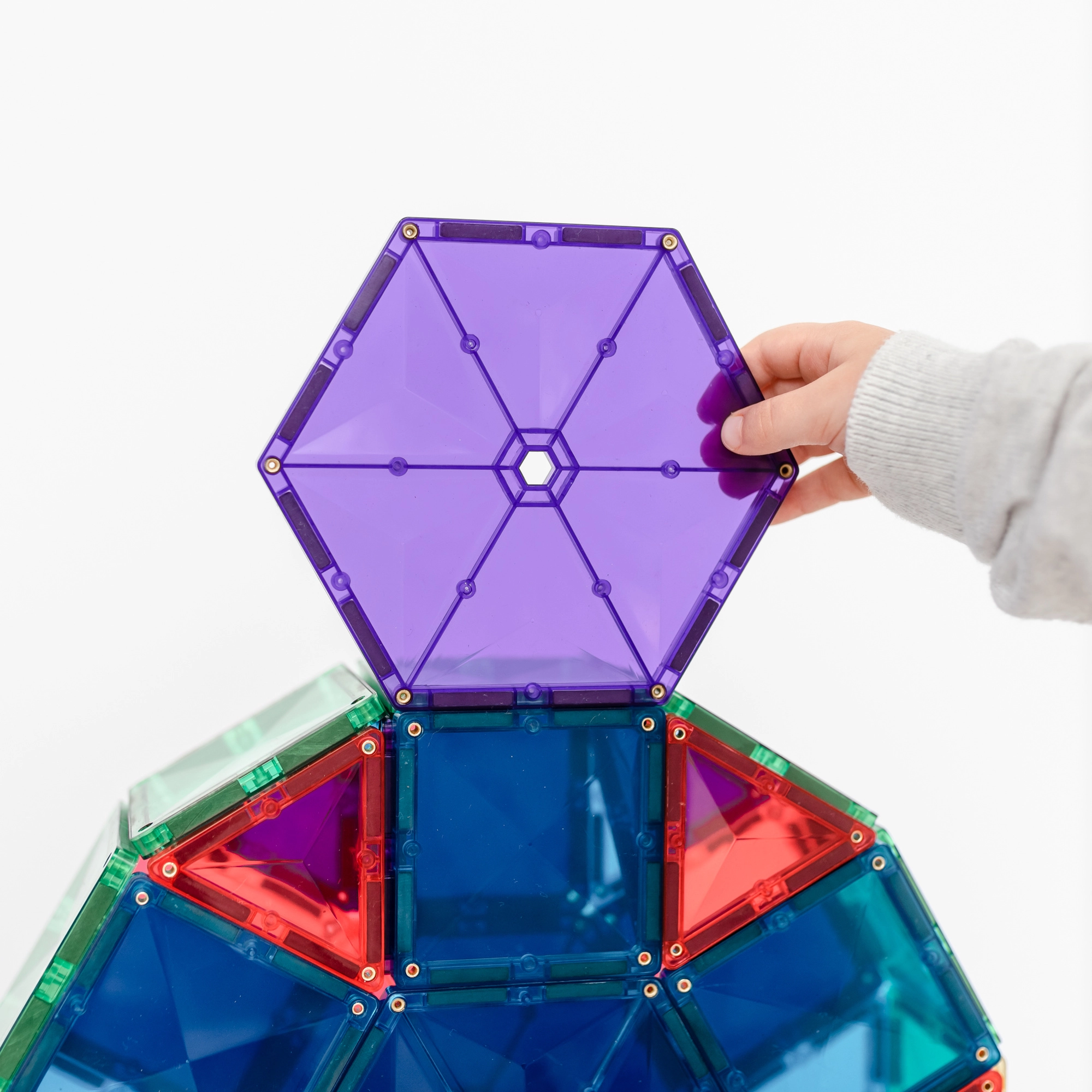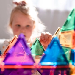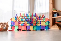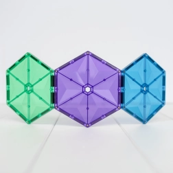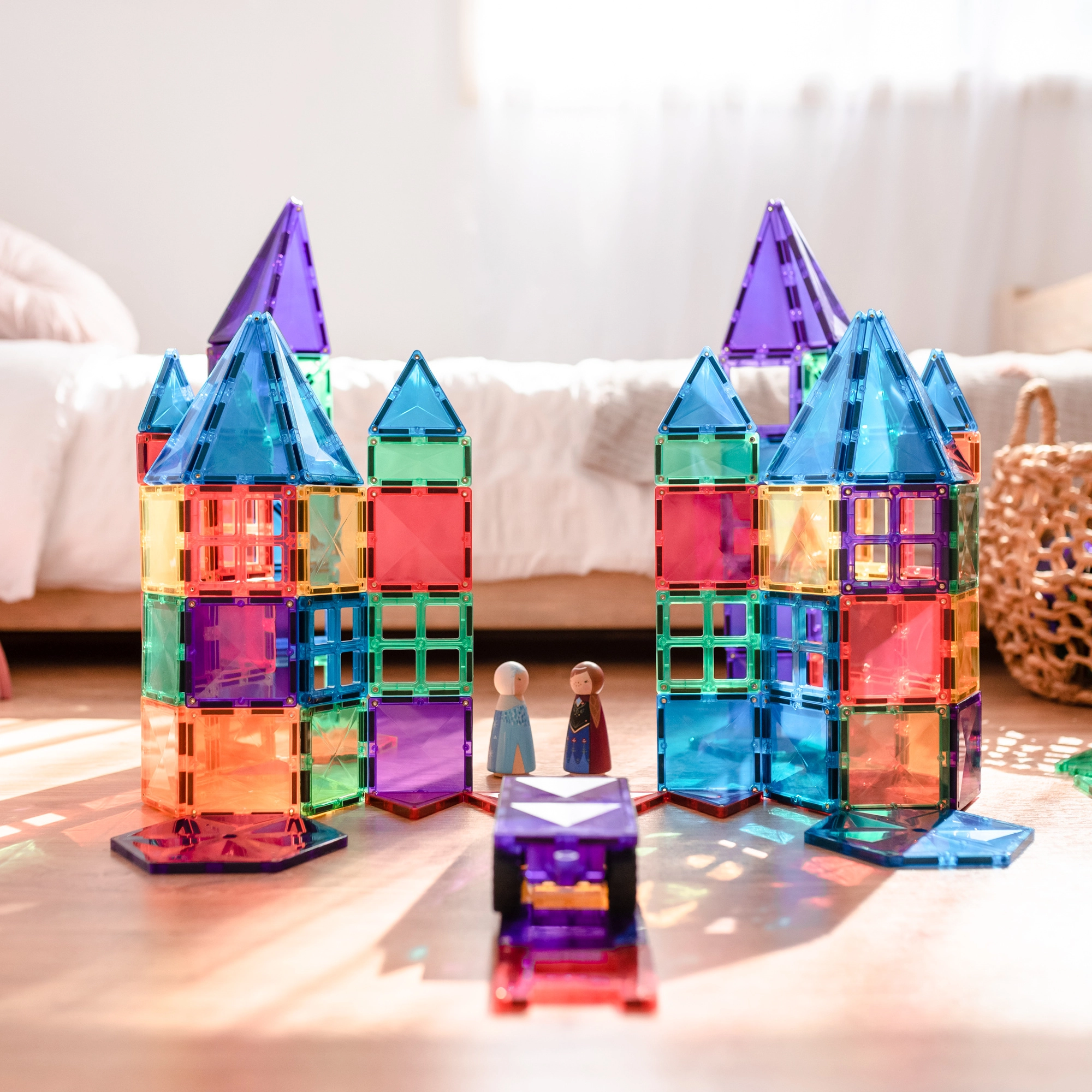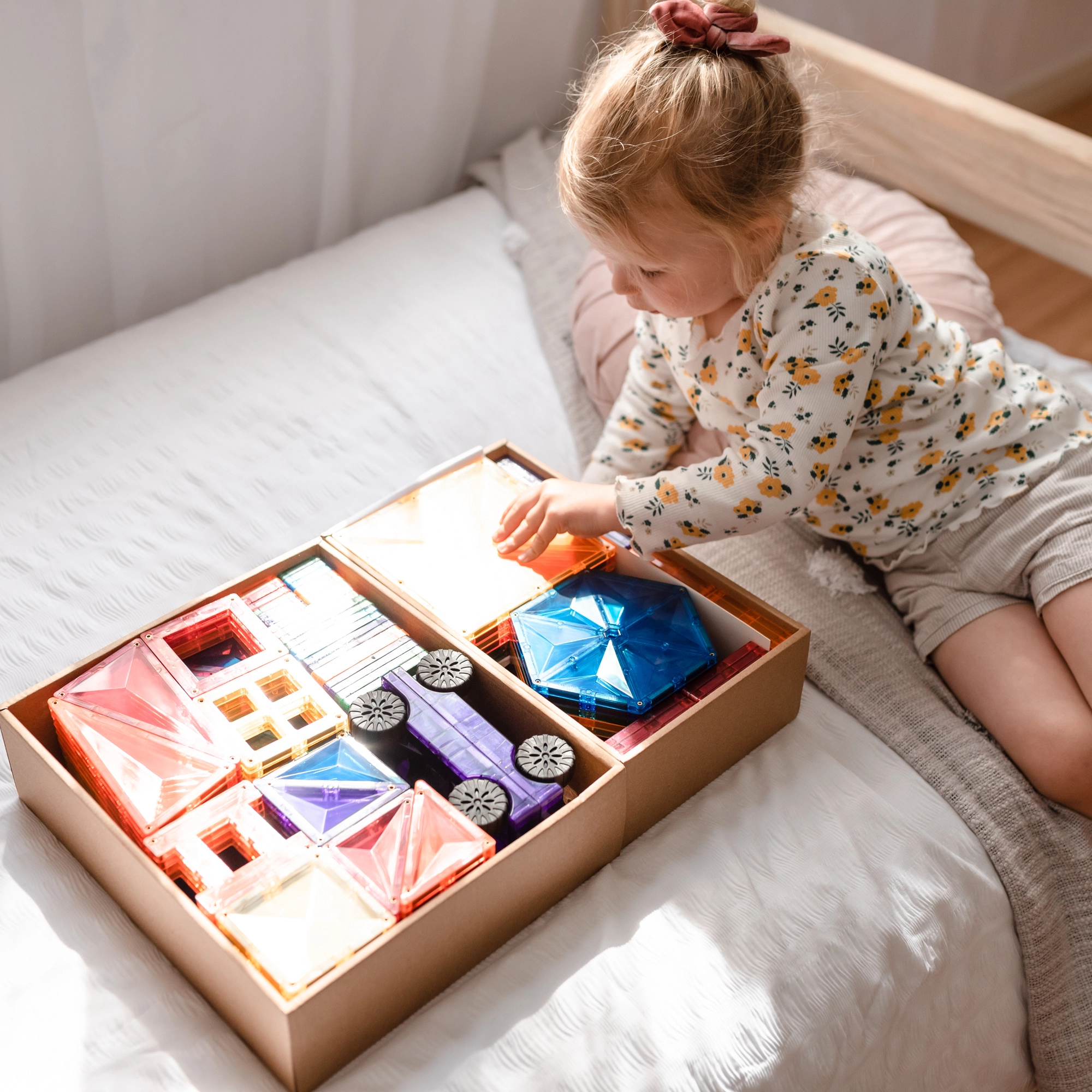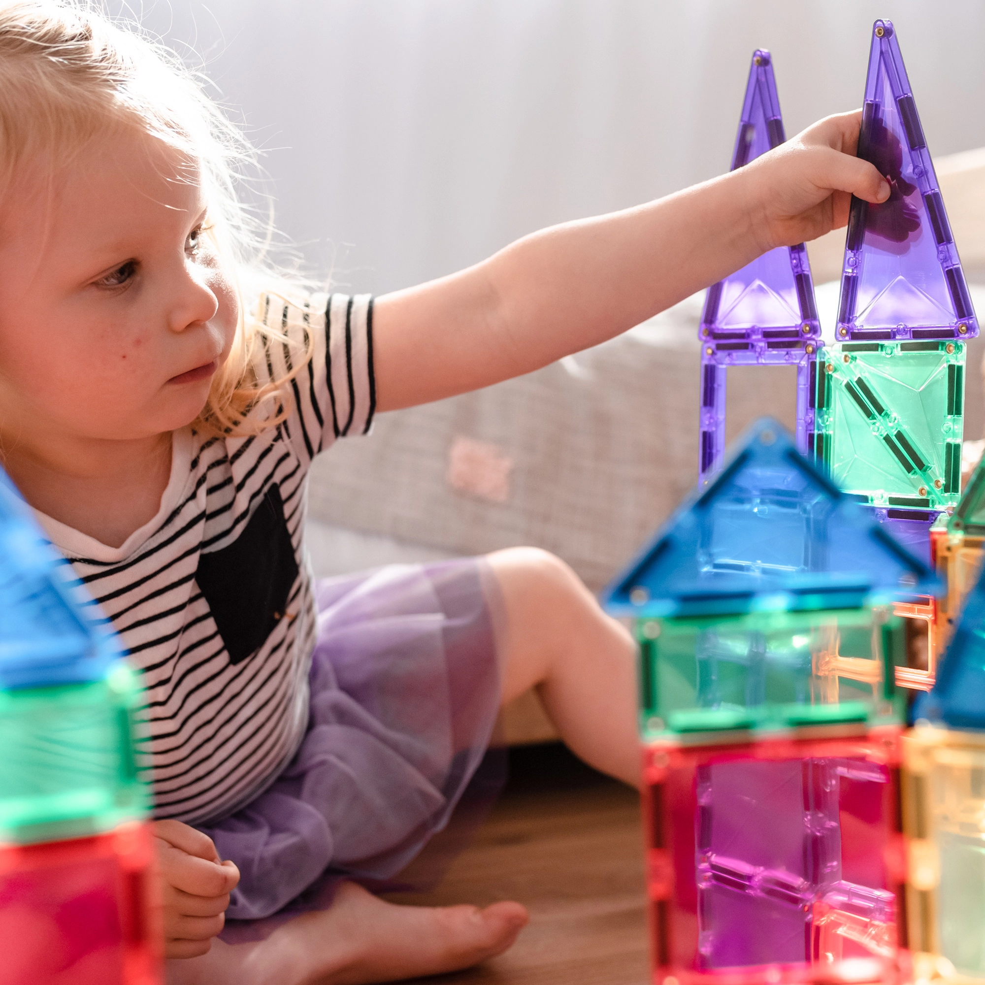 Prozirne magnetske pločice u zasićenim bojama omogućuju djeci graditi visoke tornjeve, dvorce i kuće te otkrivati svijet svjetla i sjena pri igri uz prozor ili s lampom.