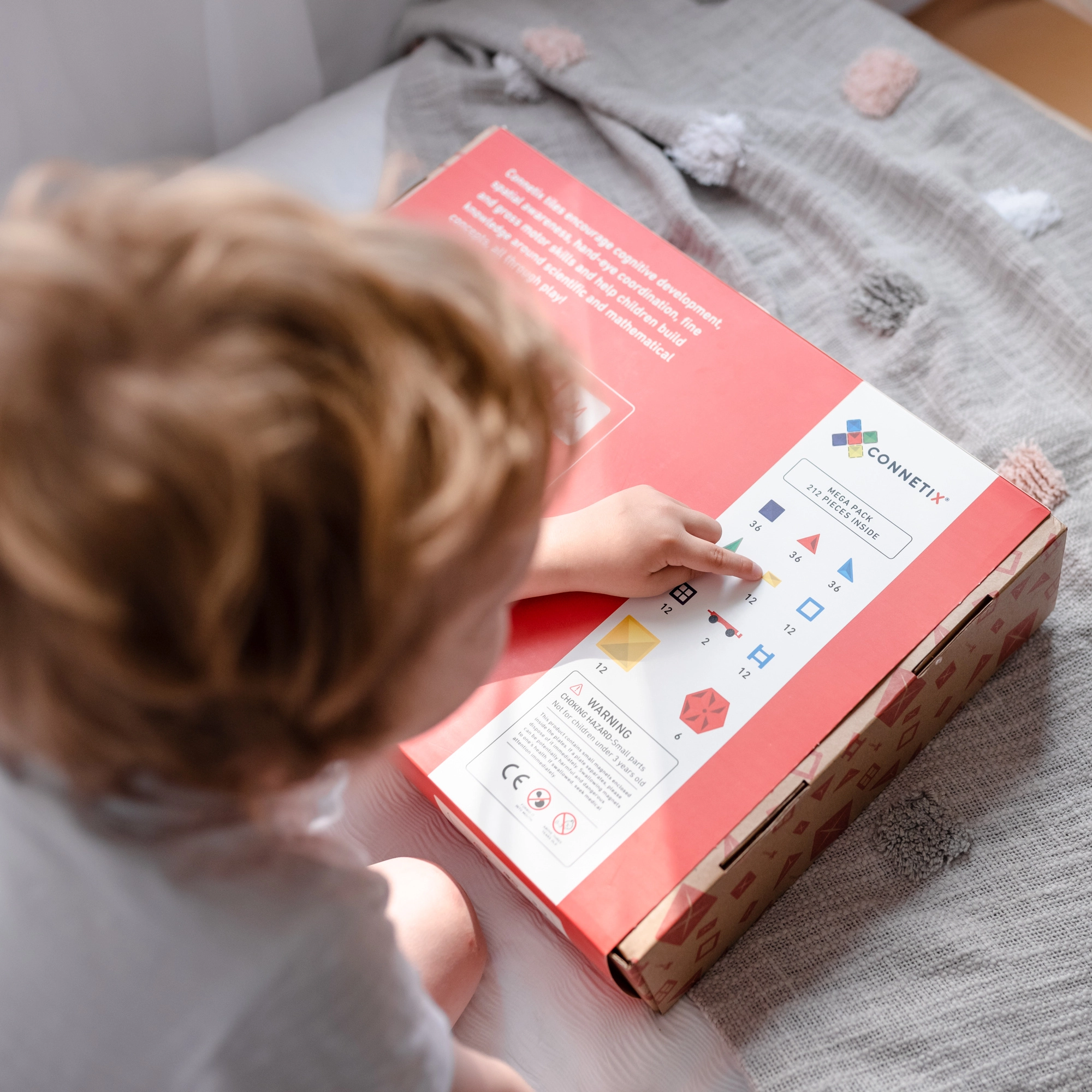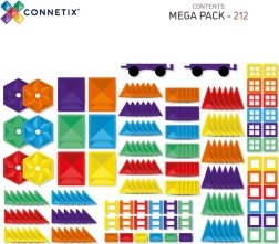 U pakiranju ćete pronaći raznoliku paletu oblika uključujući velike kvadrate i šesterokute, prozore, vrata, ograde i podvozdja s kotačima za izradu vozila. Djeca prirodno uče o simetriji, 2D/3D likovima, ravnoteži i stabilnosti konstrukcija, razvijaju koordinaciju oko–ruka i logičko razmišljanje.
