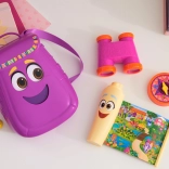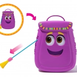 Ljubičasti ruksak s prijateljskim izrazom ima praktično otvaranje i prima sve priložene dodatke – idealno za put i igru kod kuće.