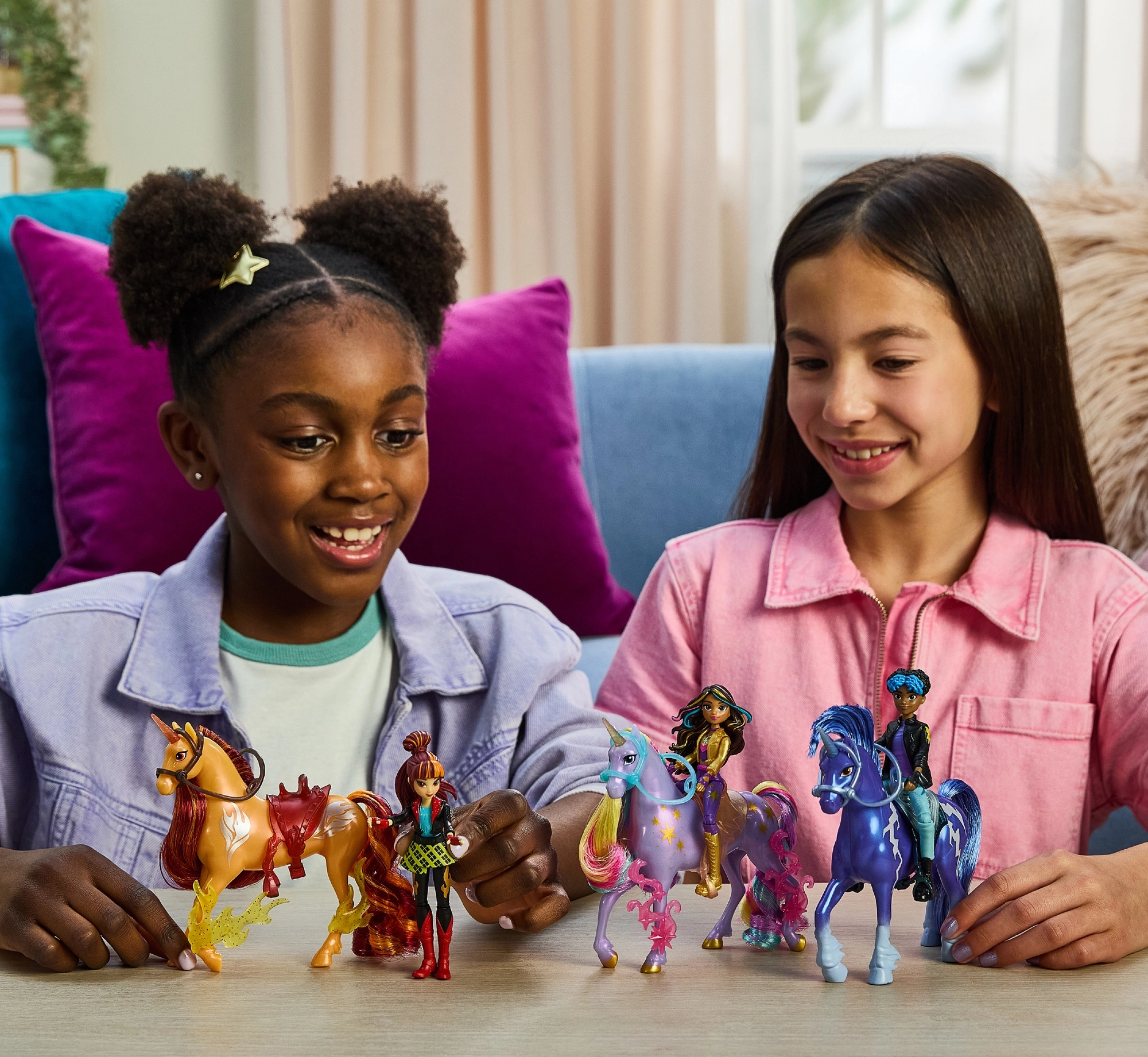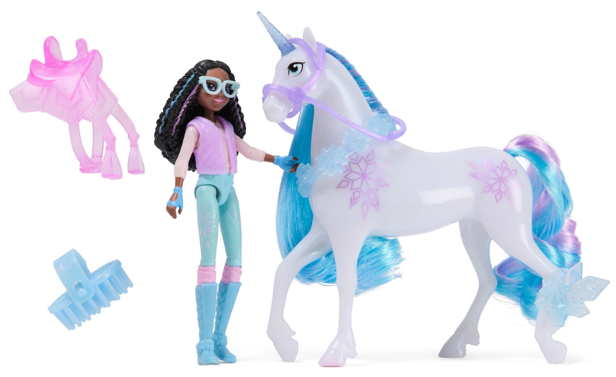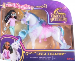 Otkrivajte čaroliju svijeta Sparkle Lake sa setom nadahnutim omiljenom serijom UNICORN ACADEMY. Lutka Layla u šarenom outfitu i jednorog Glacier s plavo‑ljubičastom grivom donose djeci sate maštovite igre. Zahvaljujući zglobnim udovima Laylu je lako posjesti u sedlo i stvarati dinamične poze.