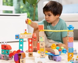 Masivni, glatki drveni dijelovi odlično leže u ruci i lako se slažu u tornjeve i jednostavne konstrukcije. Savršeno za vježbanje koordinacije i ravnoteže.