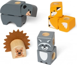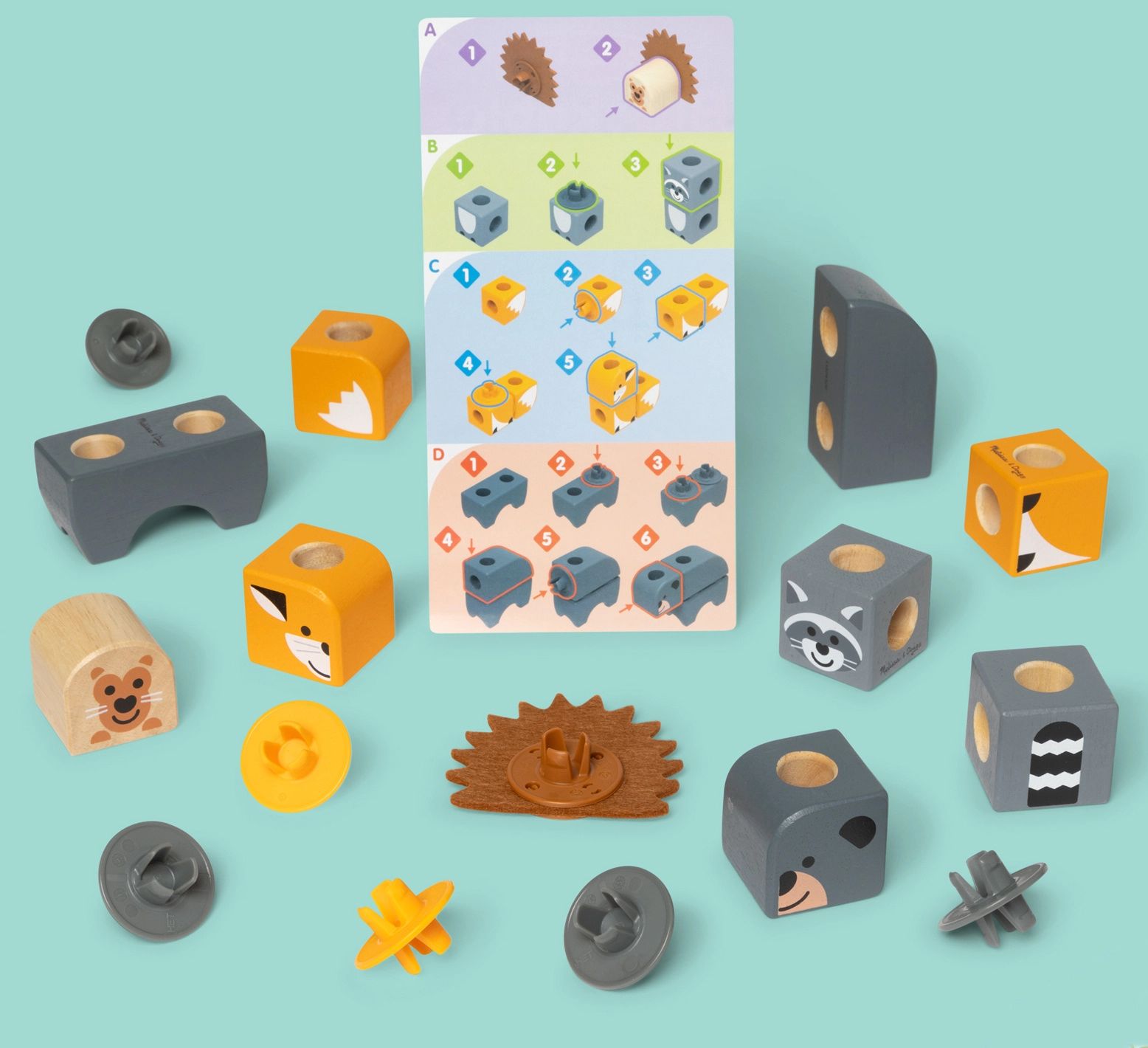 Dijelovi s tiskom životinjskih lica i tijela mogu se kombinirati u simpatične figurice i vlastite kreacije. Potiče maštu i samostalnu igru.