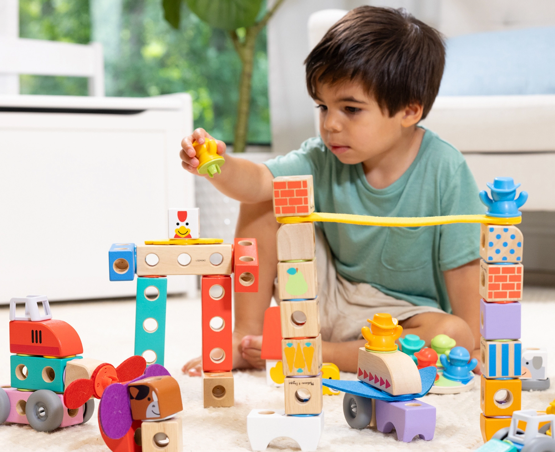 Ilustrirane kocke s otvorima i spojnicama pozivaju na sortiranje, nizanje i uparivanje. Djeca uvježbavaju prepoznavanje oblika i uzoraka te finu motoriku.