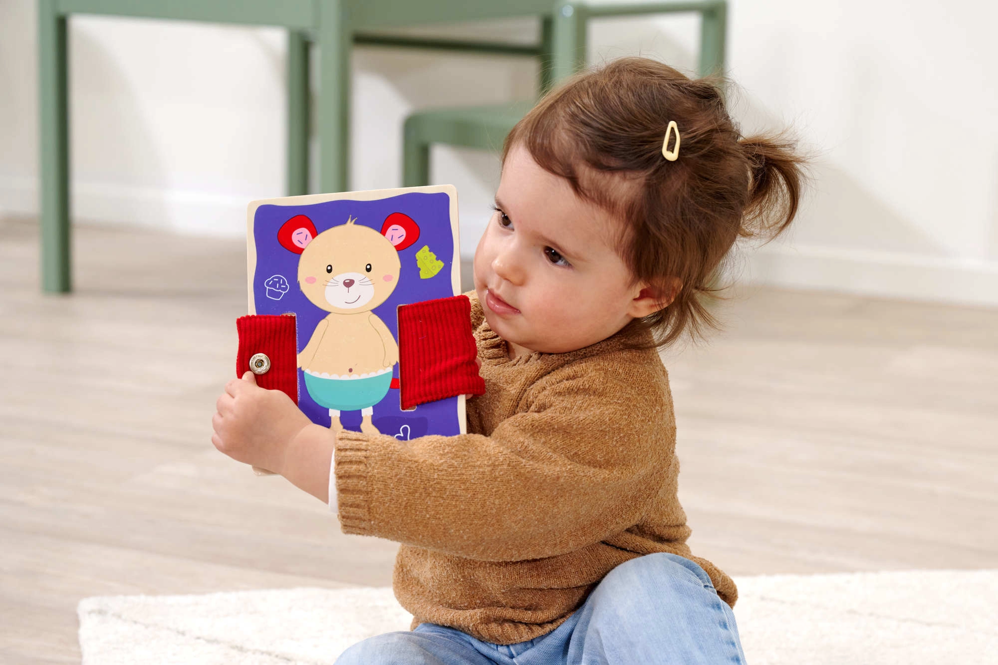 Svaka ploča predstavlja drugu vrstu kopčanja – djeca vježbaju patentni zatvarač, drukere, kopče, gumbiće i vezanje te stječu sigurnost pri oblačenju.