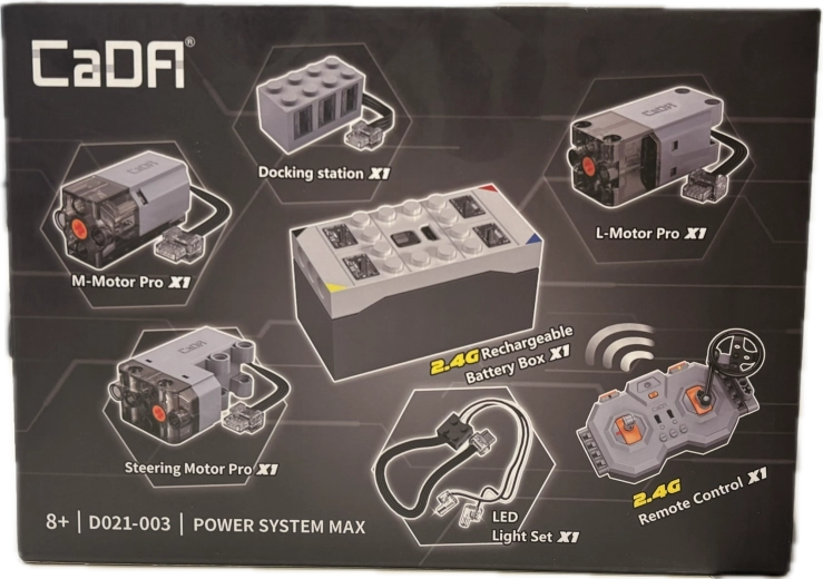 Proširite svoje CADA setove uz realističan pogon i osvjetljenje zahvaljujući setu Power System Max. Dobivate precizno 2,4 GHz upravljanje bez smetnji, dugo trajanje baterije i kompatibilnost s mnogim modelima standardne veličine. U pakiranju se nalaze tri snažna motora, LED osvjetljenje, daljinski upravljač i USB kabel za punjenje – sve što trebate za zabavu na višoj razini.