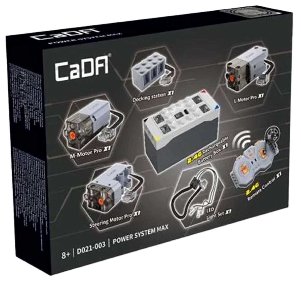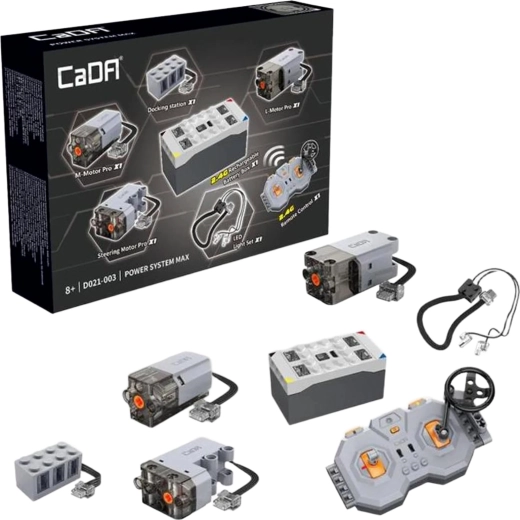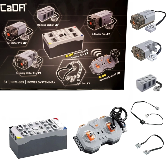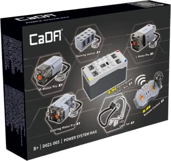 Proširite svoje setove s realističnim pogonom i 2,4 GHz daljinskim upravljanjem uz set CaDA Power System MAX. Paket uključuje akumulator, tri snažna Pro motora (M, L, Steering), LED rasvjetu, daljinski upravljač i USB kabel za punjenje za dugu i nesmetanu zabavu bez smetnji.