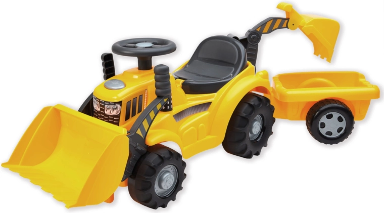 Ovaj čvrsti traktor s prikolicom donosi djeci mnogo mogućnosti za igru i razvoj motorike. Žlicu dozera lako je zamijeniti žlicom bagera, pa mali graditelji mogu utovarivati, istovarivati i prevoziti igračke prema želji. Zahvaljujući udobnom sjedalu sa skrovitim spremnikom sitnice su uvijek pri ruci.