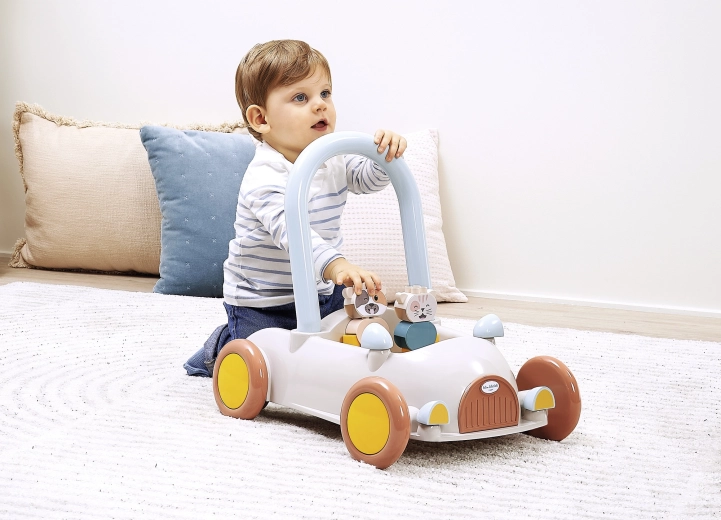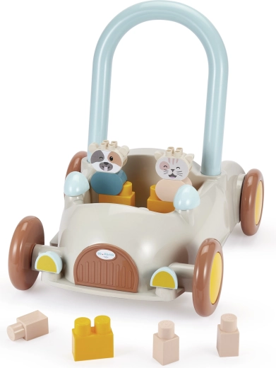 Otkrijte multifunkcionalnu guralicu s kockama koja pomaže mališanima s prvim koracima, a istovremeno ih zabavlja slaganjem. Guralica ima praktičnu ručku za guranje ili povlačenje, široka kotača za sigurnije kretanje te unutarnji prostor za kocke. U kompletu je približno 16 građevnih elemenata i dvije simpatične figurice mačkice i kravice koje potiču maštu i tematsku igru.
