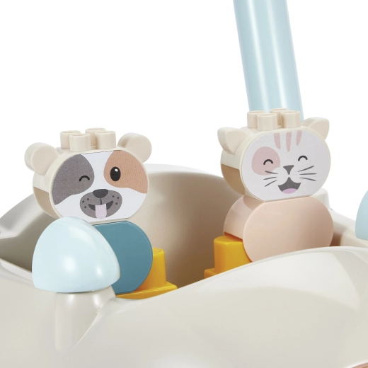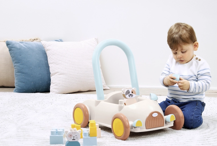 Zahvaljujući velikim, zaobljenim i lako prihvatljivim dijelovima, igra je ugodna i sigurna. Djeca prirodno razvijaju finu motoriku, koordinaciju oko–ruka, koncentraciju te uče boje i osnovne graditeljske vještine. Guralica je izrađena od izdržljive plastike koja podnosi svakodnevnu upotrebu kod kuće i na tepihu.