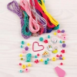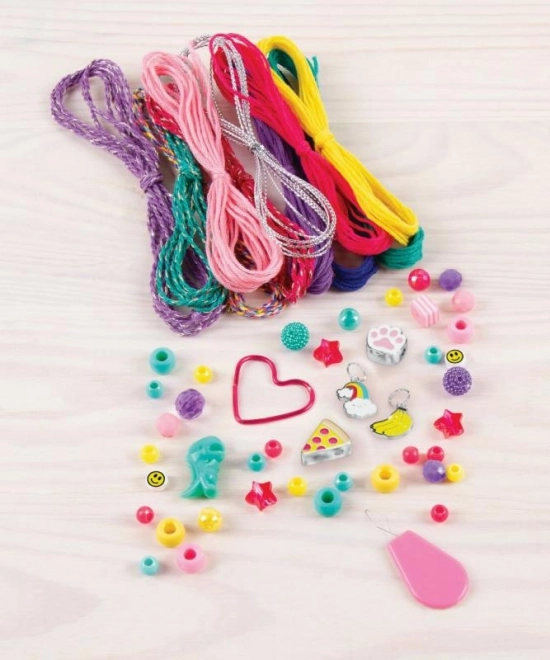 7 šarenih pamučnih konaca, metalizirana srebrna uzica, 3 šarena konopa, perlice, privjesci i jasne upute – stvaranje može početi odmah.