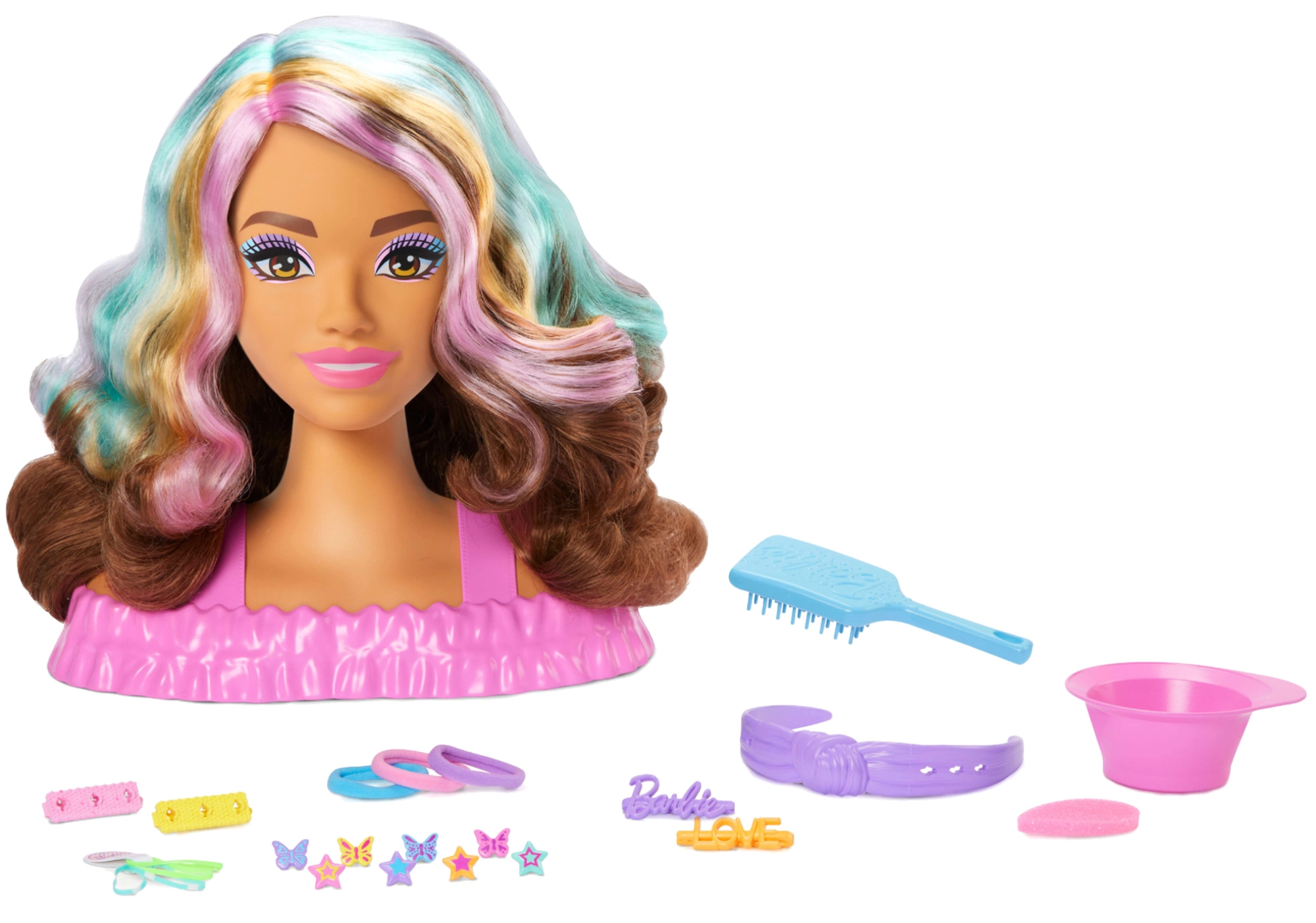 BARBIE glava za češljanje donosi djeci beskrajne mogućnosti izrade frizura. Duga smeđa kosa s ružičastim, narančastim i tirkiznim pramenovima odlično drži oblik i poziva na pletenje, pričvršćivanje i ukrašavanje. Zabavnu čaroliju dodaju kopče i usne koje mijenjaju boju nakon primjene vode i spužvice.