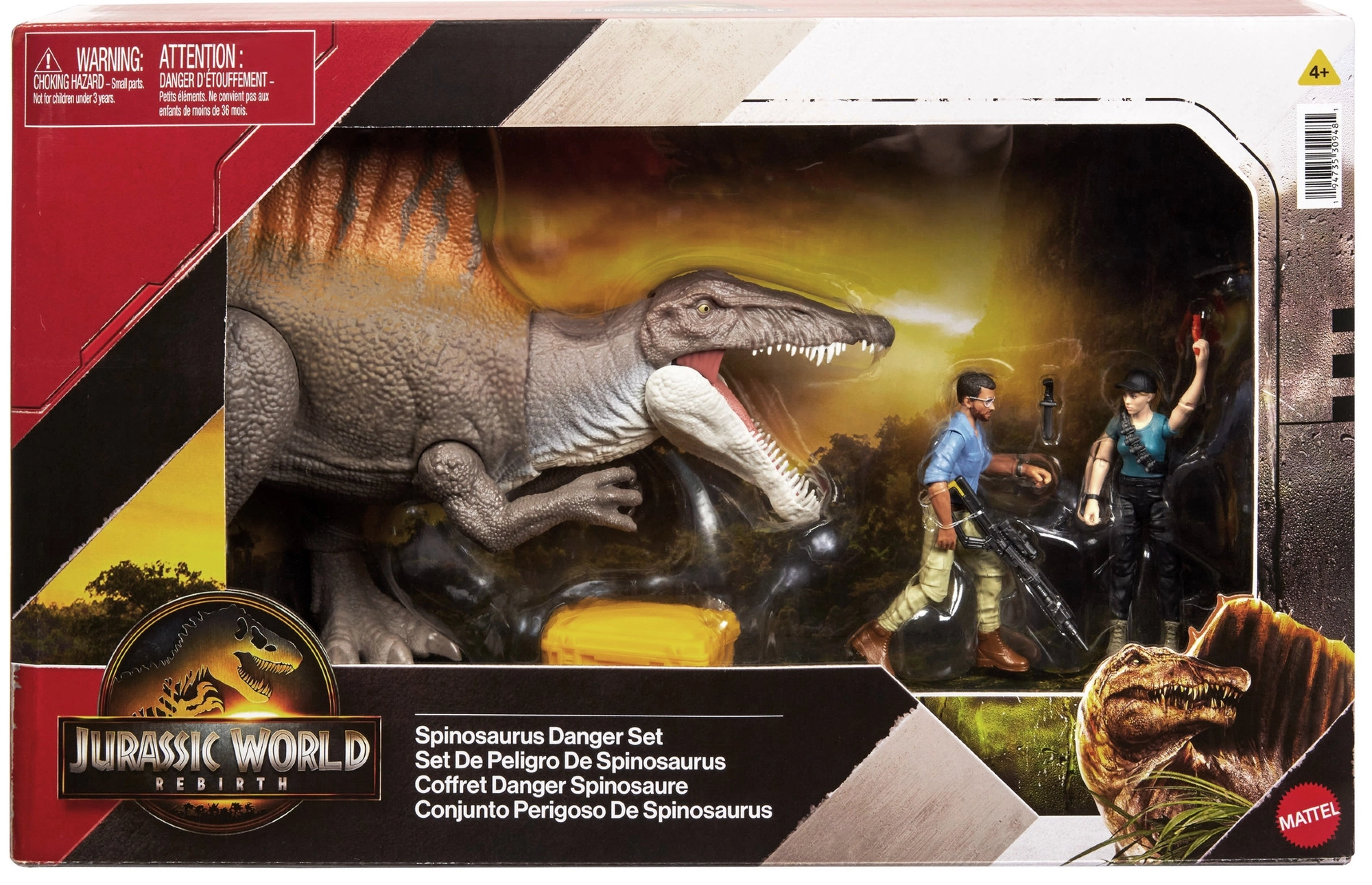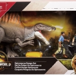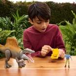 Ovaj set brenda Mattel donosi realistično oblikovanog Spinosaurusa s izraženom leđnom jedrom, otvorivim raljama i pokretnim zglobovima. Dvije ljudske figure s dodacima – oružjem, alatima i žutom transportnom kutijom – proširuju mogućnosti igre i omogućuju stvaranje napetih scena potjere i spasilačkih misija.