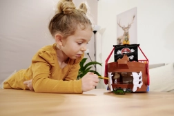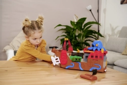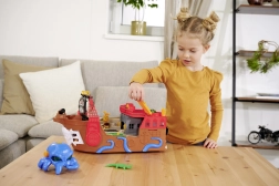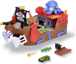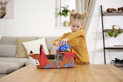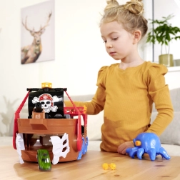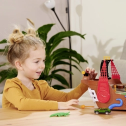 Ovaj detaljno izrađen gusarski brod pravo je središte zabave. Podizanjem palube otkriva se ugrađena staza za metalni autić, gdje pomoću poluga i prekidača odlučujete hoće li vozilo poletjeti kroz kosturska vrata, završiti u zatvoru ili biti katapultirano sa splava. Tu su i funkcionalni top, škrinja s blagom, bačve, krokodil i drugi dodaci koji potiču maštovitu igru.