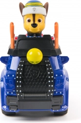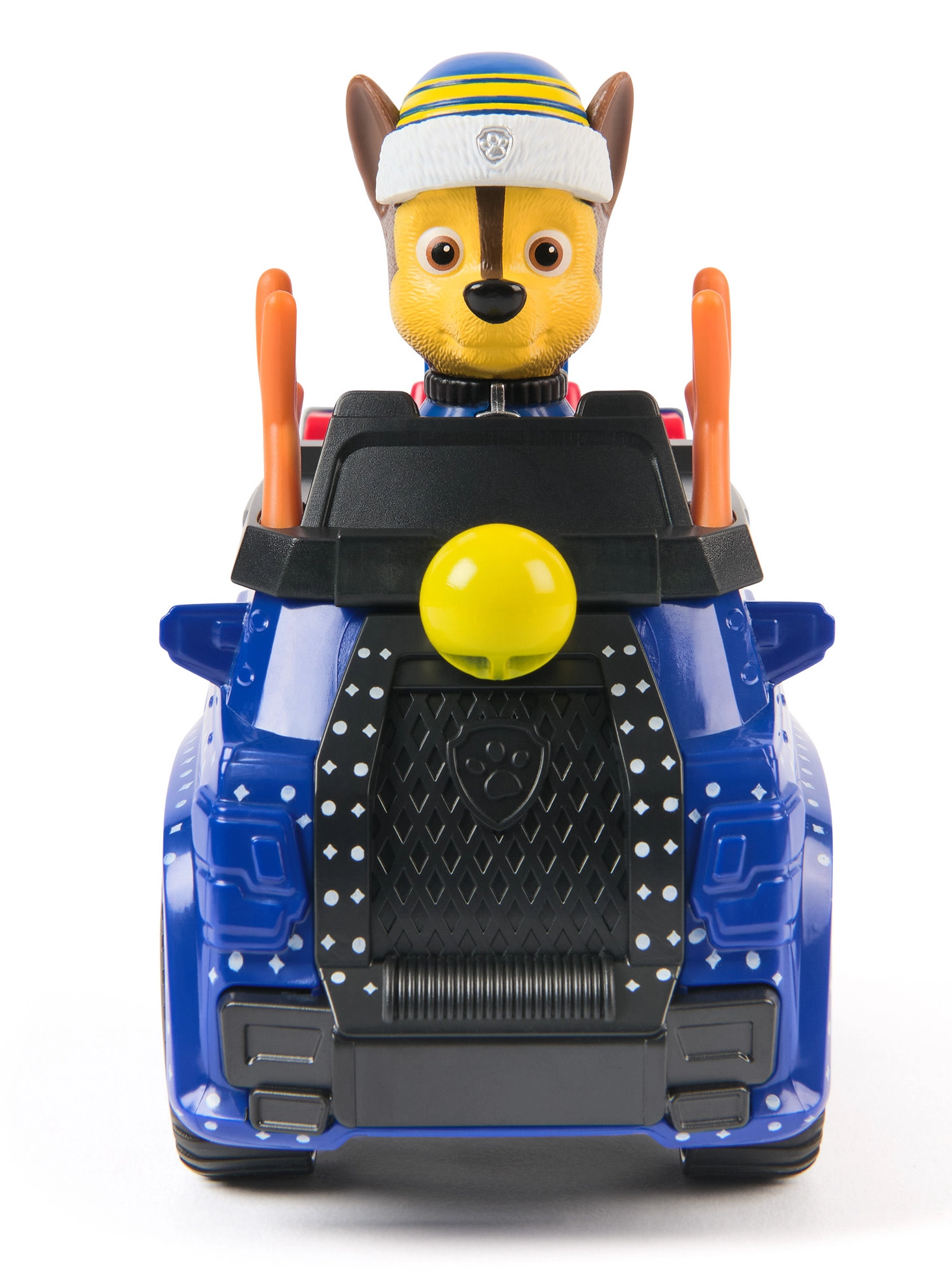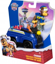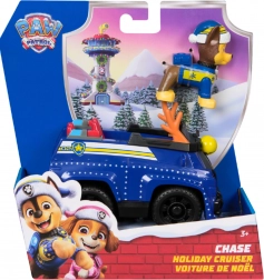 Detaljan plavi automobil s božićnim elementima i pokretnim kotačima. Figurica CHASE u zimskog kapi sjedi izravno u kokpitu i spremna je za akciju.
