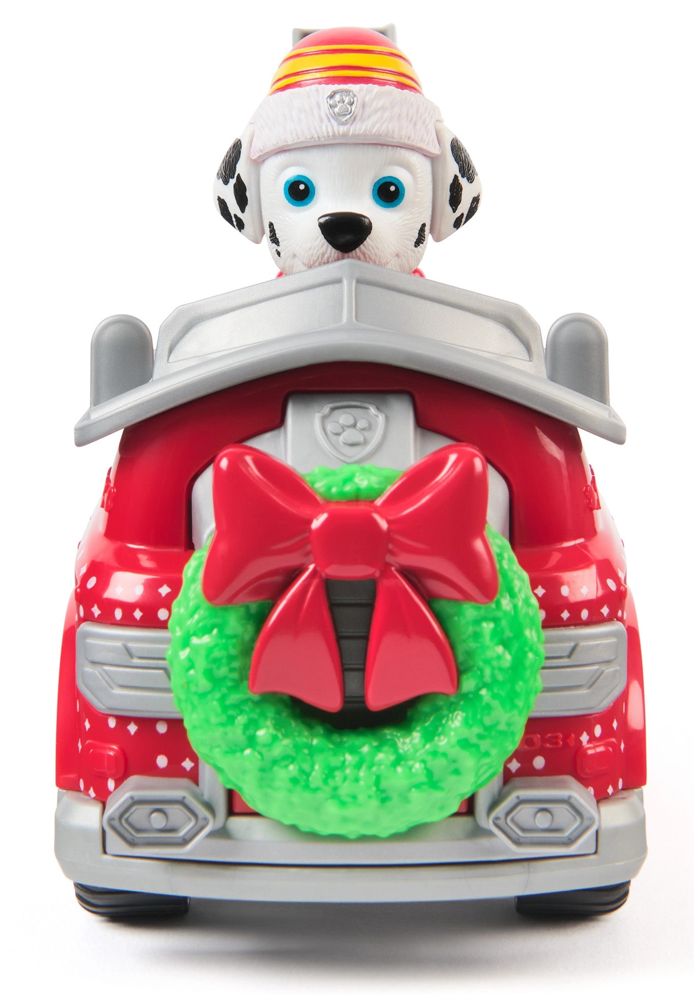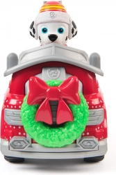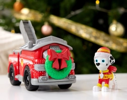 Crveno vatrogasno vozilo krasi zeleni vijenac s mašnom i zimski motivi. Marshall u toploj kapi priprema svaku misiju za zimu.