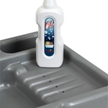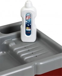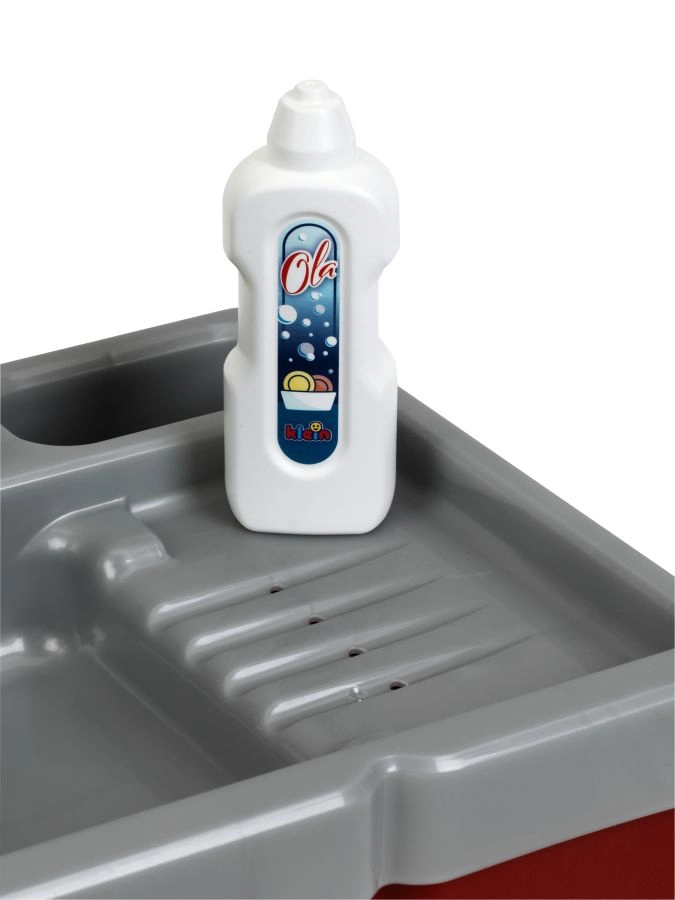 Dovoljno je napuniti spremnik i okrenuti regulator – voda teče kao u pravom sudoperu. Djeca mogu sigurno isprobati pranje tanjura i pribora.