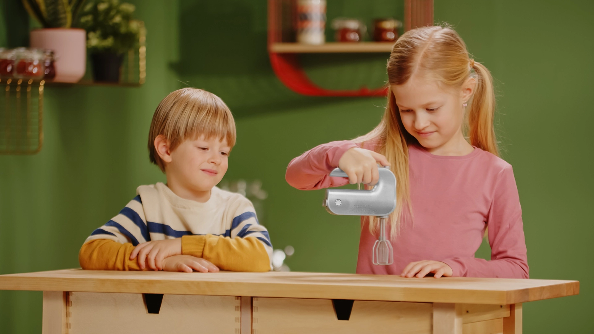 Nakon pritiska na gumb metlice se zavrte i vjerno oponašaju rad pravog ručnog miksera – zabava i autentičnost u jednom.