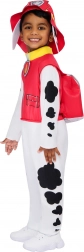 Presladak dječji kostim PAW PATROL Marshall za male junake od 2–3 godine. Jednodijelna kombinezon s dalmatinskim točkama, crvenim vatrogasnim prslukom, kapom s ušima i praktičnim ruksakom pretvara dijete u omiljenog psećeg spasioca. Idealno za karneval, Noć vještica, tematske zabave i svakodnevno igranje uloga.
